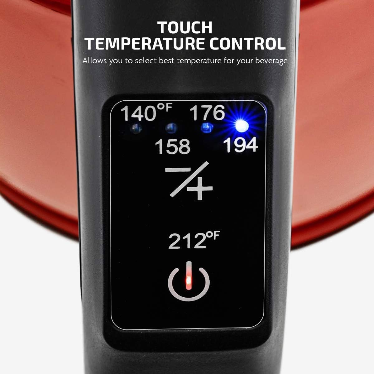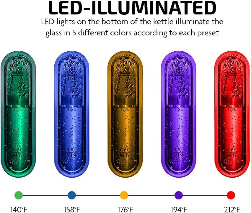 • 5 PRESET SETTINGS - Extract the richest taste and fullest flavors from every coffee bean and tea leaf with ease! Simply press the temperature settings button to select the perfect temperature for your beverage, ranging from 140°F, 158°F, 176°F, 194°F up to 212°F. The LED lights at the bottom illuminate in 5 different colors to indicate each preset temperature.