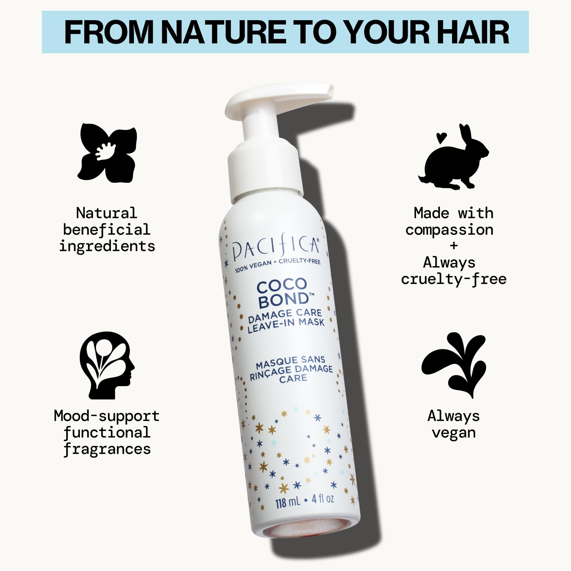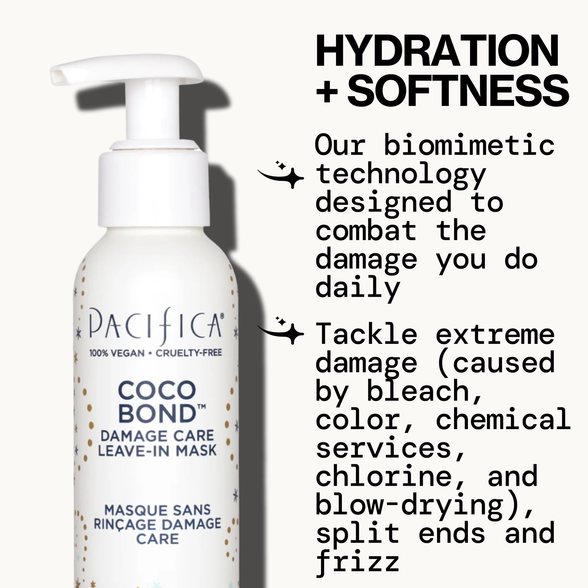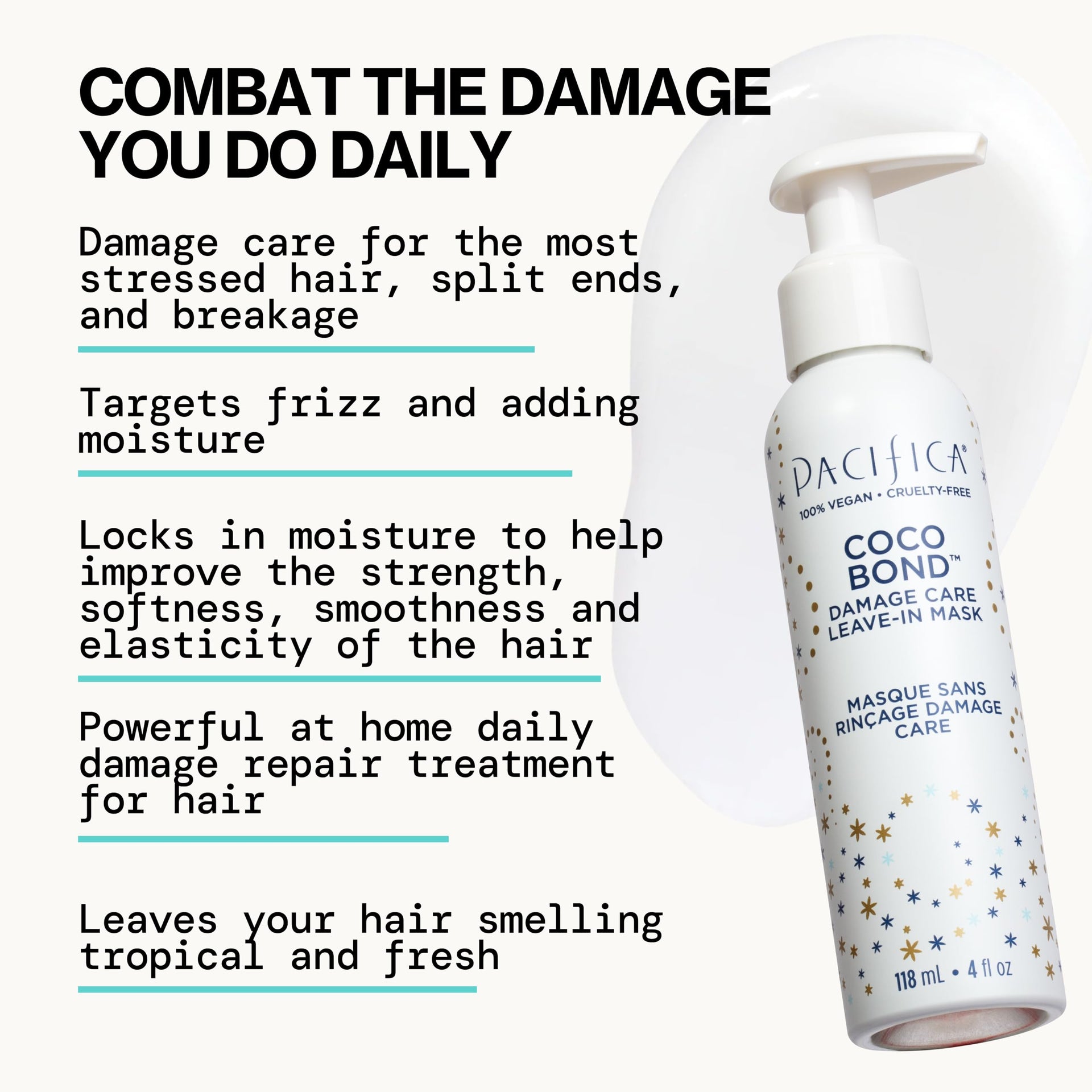 Rescue for Extremely Damaged Hair: When hair has been pushed to its limits by bleaching, coloring, chemical treatments or excessive heat, ordinary conditioners just won’t cut it. Pacifica’s Coco Bond Damage Care Leave-In Repair Mask is an intensive treatment designed to bring fried, brittle strands back from the brink. It tackles extreme damage head-on: think of it as rehab for hair that’s dry, frizzy, breaking or over-processed. Use it to help reverse the signs of damage - from straw-like texture and split ends to loss of shine - and restore your hair’s soft, strong, and healthy look.Bond-Building, Strength-Restoring Formula: This concentrated mask uses biomimetic technology to repair hair at a structural level. Powered by fermented vegan collagen peptides (which mimic the keratin bonds in your hair), it works to reconnect broken disulfide bonds and “fill in” microscopic cracks in the hair shaft. The result? Improved strength and elasticity - less breakage when you brush, and fewer split ends over time. Hair becomes more resilient with each use, regaining the flexibility and bounce it lost to chemical or heat damage. Consider it a salon-style bonding treatment you can use at home, whenever your hair needs a rescue.Nutrient-Rich Ingredients: Coco Bond is infused with a blend of nourishing, plant-powered ingredients that hydrate and protect damaged hair: Coconut Oil - Rich in lauric acid and lipids that penetrate deeply to moisturize and help reduce protein loss, leaving hair softer and less frizzy. Pro-Vitamin B5 - Also known as panthenol, it binds to the hair shaft, improving moisture retention, reducing split ends, and adding glossy shine. Vegan Biotin - A plant-derived form of vitamin B7 that supports hair’s keratin structure for stronger, more resilient strands. Aloe Vera - A soothing botanical that provides lightweight hydration and contains polysaccharides which help smooth the cuticle and enhance shine. Niacinamide - A form of vitamin B3 that helps improve the appearance of elasticity and protects hair against environmental stressors.Easy Leave-In Treatment: Using this mask is as easy as applying a leave-in conditioner. After washing your hair, squeeze out excess water. Work a generous amount of the Coco Bond mask through clean, damp hair, concentrating on the most damaged areas (usually mid-lengths to ends). There’s no need to rinse - just style your hair as you normally would. The creamy formula absorbs without a heavy or sticky feel, so you can even use it as an overnight repair treatment. For very damaged hair, use it every wash; for maintenance, 1-2 times a week is enough. You’ll find your hair detangles more easily, and feels smoother and stronger when you leave this in.Clean, Worry-Free Ingredients: Like all Pacifica products, this leave-in mask is formulated without a long list of undesirable additives. You won’t find parabens, phthalates, sulfates, silicones, mineral oil, or petrolatum here - so your hair can heal without heavy build-up or further irritation. The formula is 100% vegan and certified cruelty-free, so no animal testing or animal-derived ingredients. It’s also safe for color-treated and chemically-treated hair (it won’t strip color or affect salon treatments). **Dermatologist tested**, and packaged in a recyclable tube to support your eco-friendly lifestyle.Transform Your Hair’s Future: With regular use of the Coco Bond Damage Care Mask, you’ll notice a dramatic improvement in how your hair looks and feels. Split ends will appear diminished, frizz will be tamed, and rough, dull hair will regain a healthy-looking gloss. Previously fragile hair will become easier to style and comb without snapping. Pacifica’s advanced vegan formula gives you salon-level repair results at home - and because it stays in your hair, it keeps working long after you apply it.