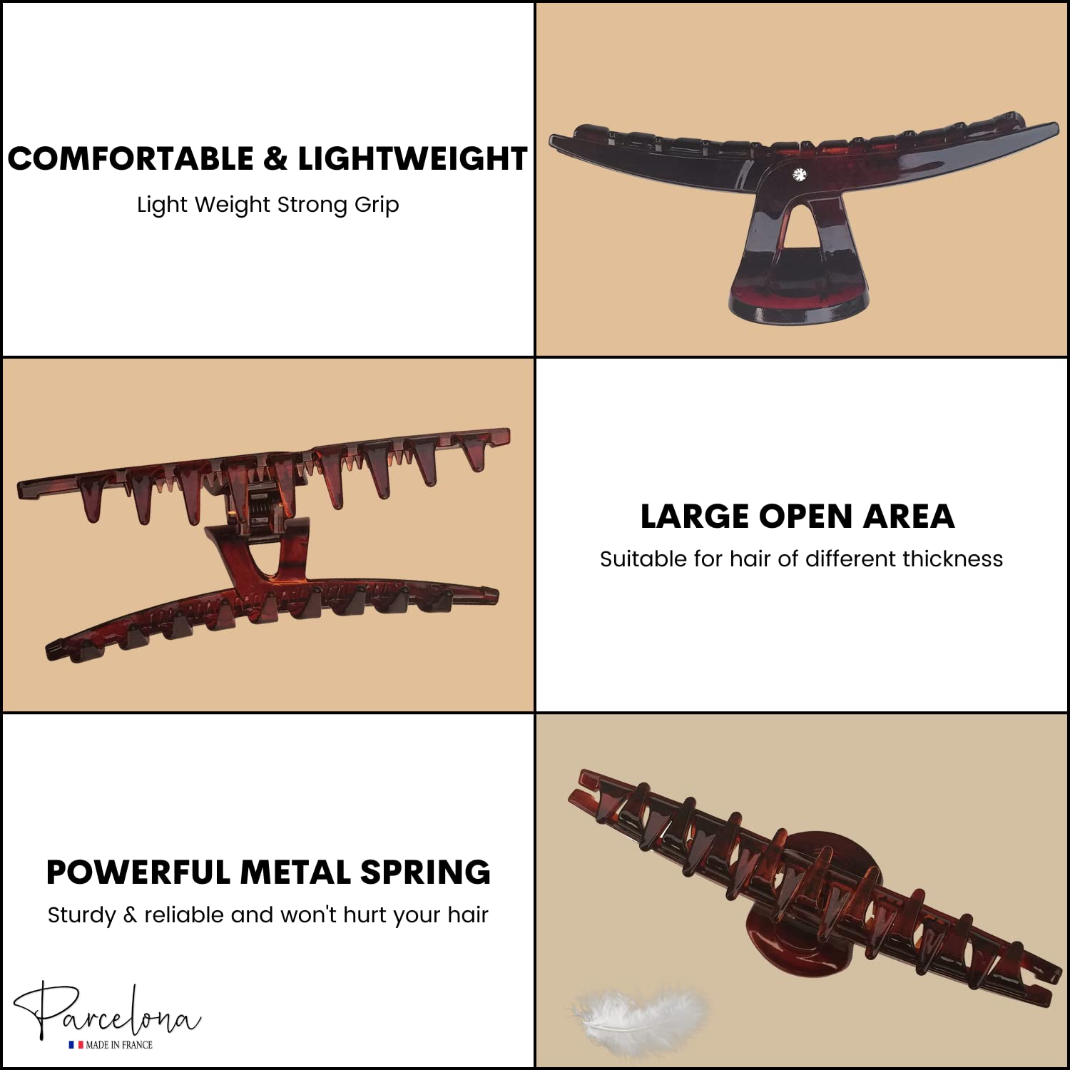 The Parcelona Hair Collection provides a variety of women hair accessories made in France. All the products are made from cellulose acetate, perfectly polished for a splendid finish, distinctive patterns, and designs. This collection brings you a vast array of hair accessories ranging from hair claws, barrettes, combs, clips and more. The products feature classic, and imperishable designs which complement any hair type from short to long, fine to thick, and straight to curly: a versatile collection rare in retail stores. The Parcelona hair accessories are elegant and exquisite, and perfectly assorted to give your hairstyle an aesthetic look.