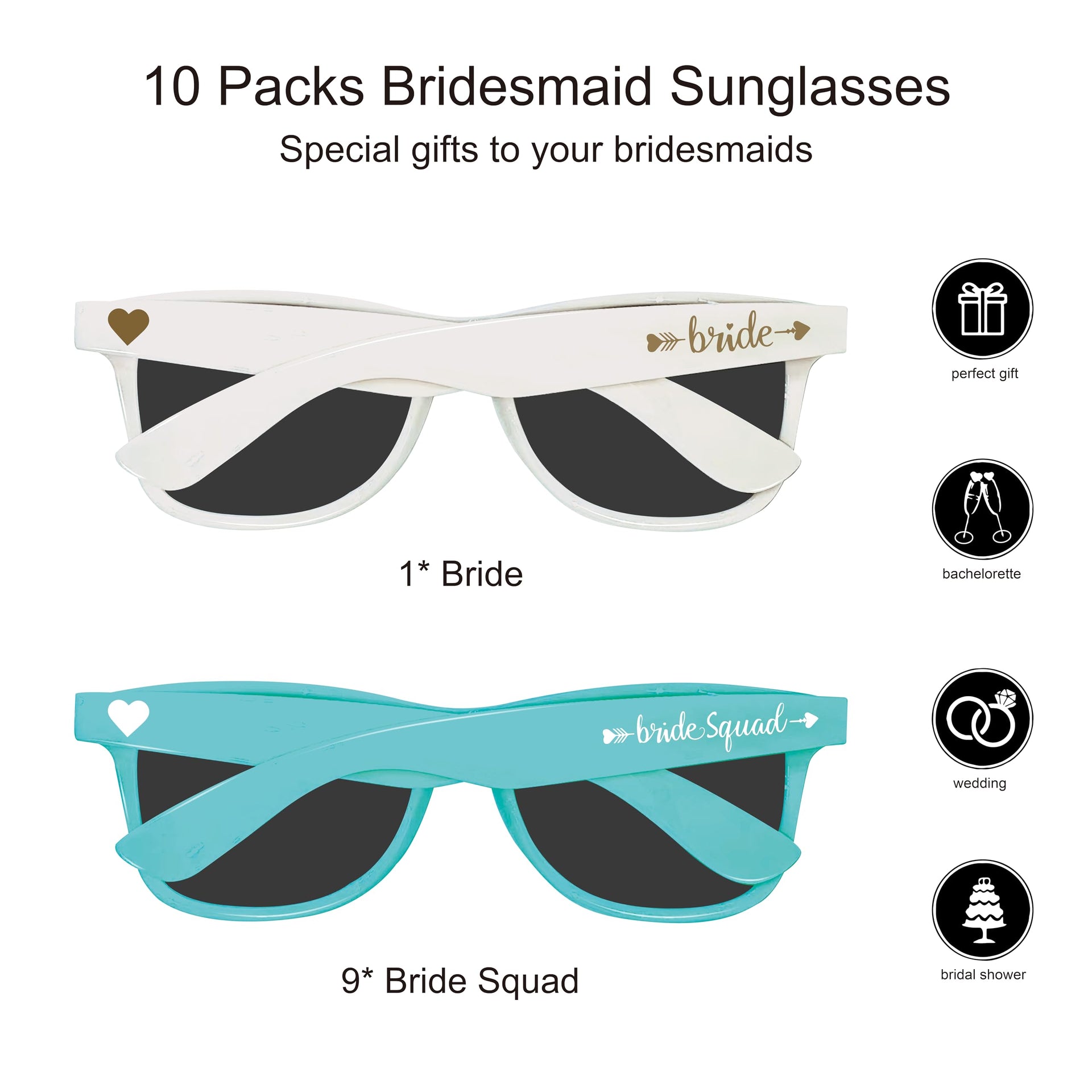 • 【Bachelorette Sunglasses】:This bride sunglasses for bachelorette party contain a total of 1 pair of Bride sunglasses and 9 pairs of Bride Squad sunglasses. Ideal for bachelorette parties, engagement celebrations, and wedding receptions.