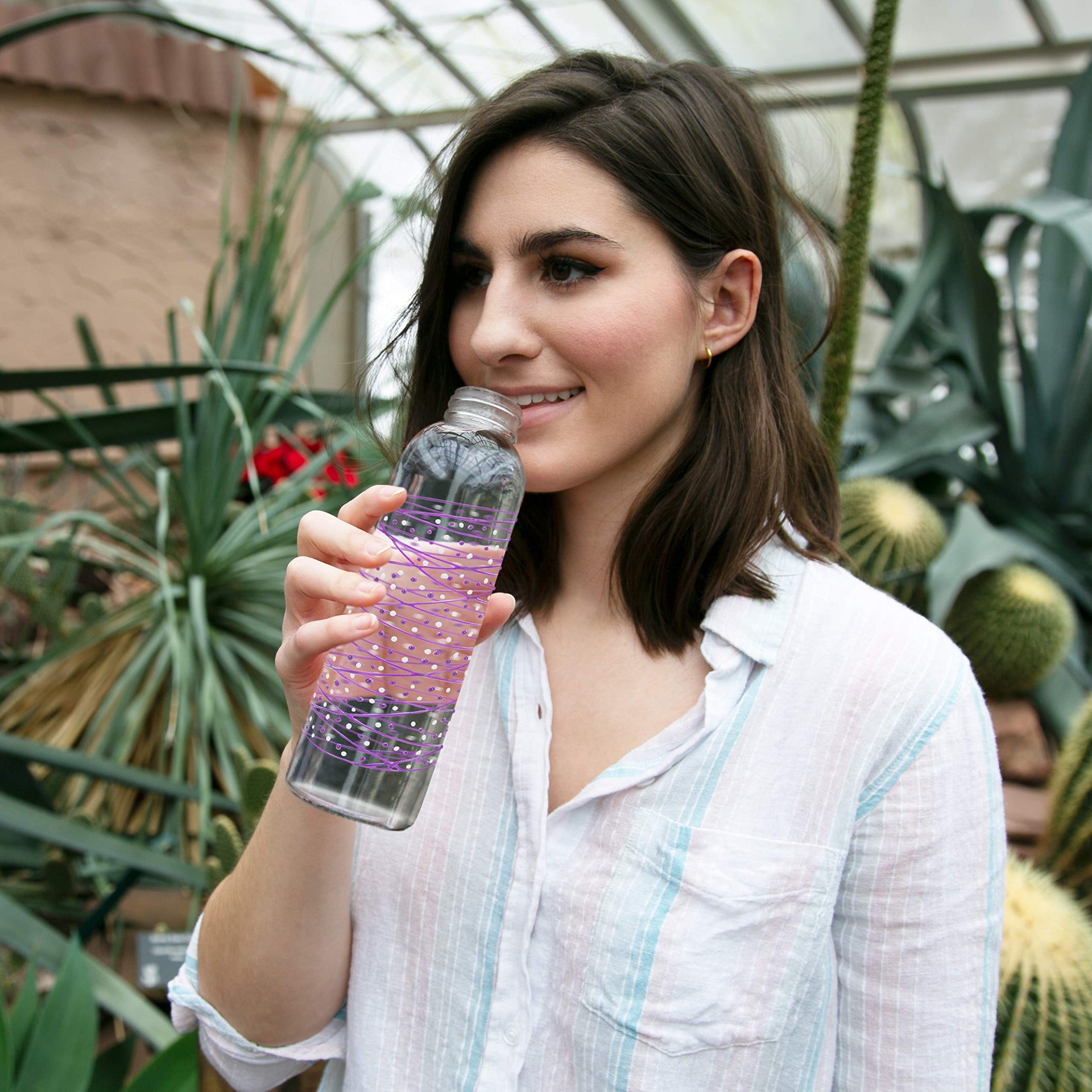 • PREMIUM QUALITY: 16.5oz water bottle, packaged in a printed open-faced box, is made from glass and metal and features a ribbon handle and a rubber seal.