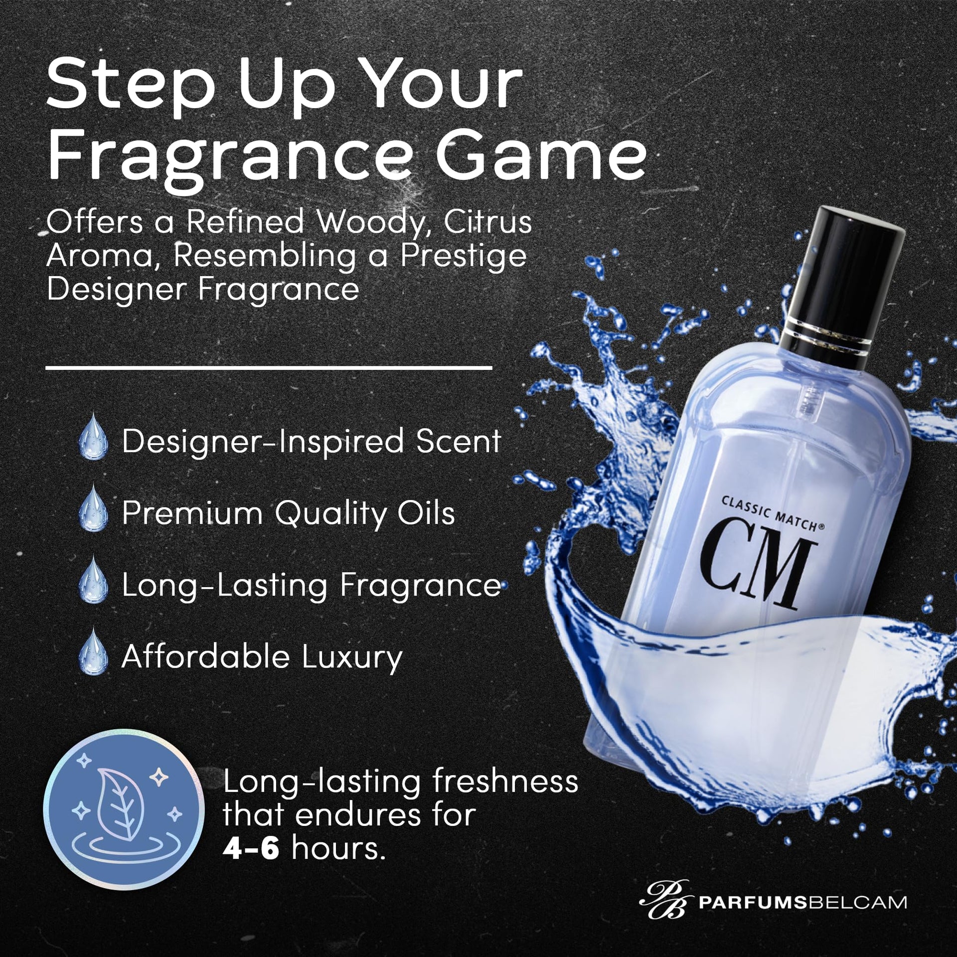 Classic Match CM Eau de Toilette Spray is a refined woody, citrus scent. White grapefruit and iced ginger blend with sparkling ozone notes, hints of lavender, warm sandalwood and amber. A long-lasting fragrance formulated with premium quality oils. Have you found a designer fragrance you really like but would prefer a more affordable option? This eau de toilette version of a prestige designer fragrance* gives you long-lasting fragrance at a fraction of the cost. Try this refined woody citrus scent and be impressed by how similar this version is to the original! Classic Match CM Eau de Toilette Spray gives you long wearing fragrance that is an impression of the prestige original. Spray on your wrists, bend of your arms or on your neck for lingering scent. *ParfumsBelcam fragrances are not associated with the brand name manufacturer.