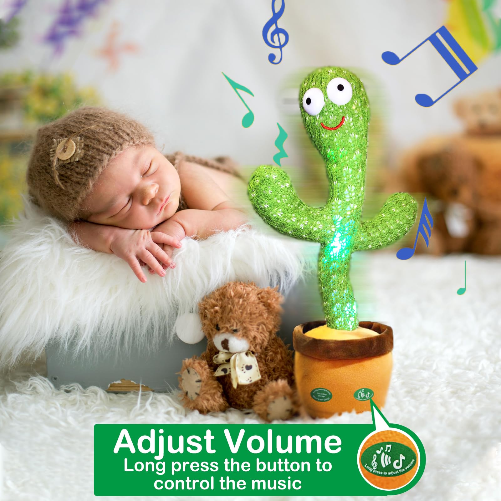 • [Update Adjustable Volume] This dancing singing cactus baby toy has a volume adjustment function, which can achieve 5 levels of volume adjustment. When playing or sleeping, you can adjust the volume as needed. How to operate: Press and hold the right button on the toy for 5 seconds to increase or decrease the volume.