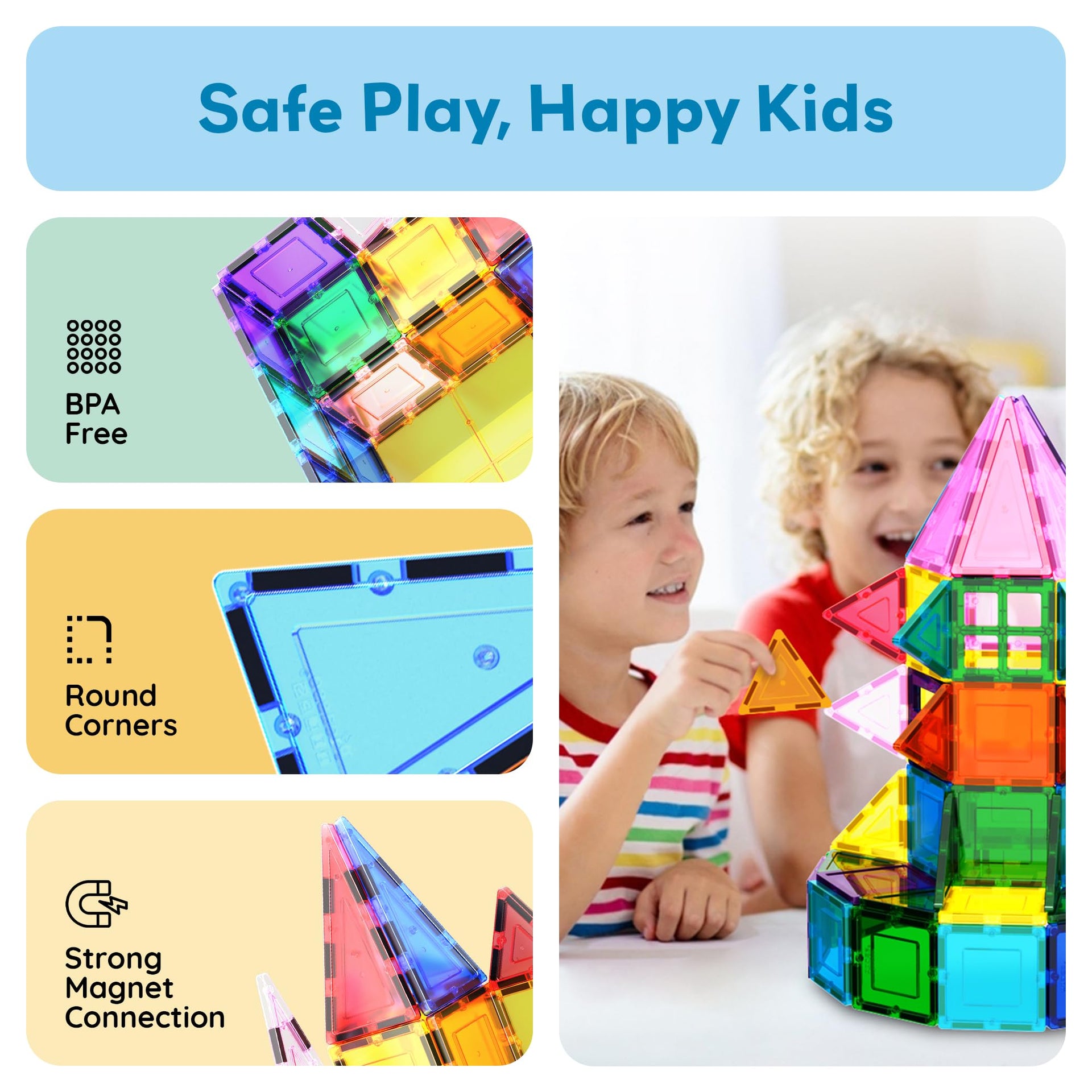 - BPA-FREE & NON-TOXIC: We place safety above all else. Our Magnet Building toy set is BPA-free and non-toxic, creating a safe environment for your child's playtime. Every compact tile is thoughtfully shaped with smooth edges, enhancing the protective shield against any accidental cuts or bumps. With us, you're not only guaranteeing enjoyable amusement, but also embracing the peace of mind that comes from knowing your little one’s exploration is shielded from harmful elements."