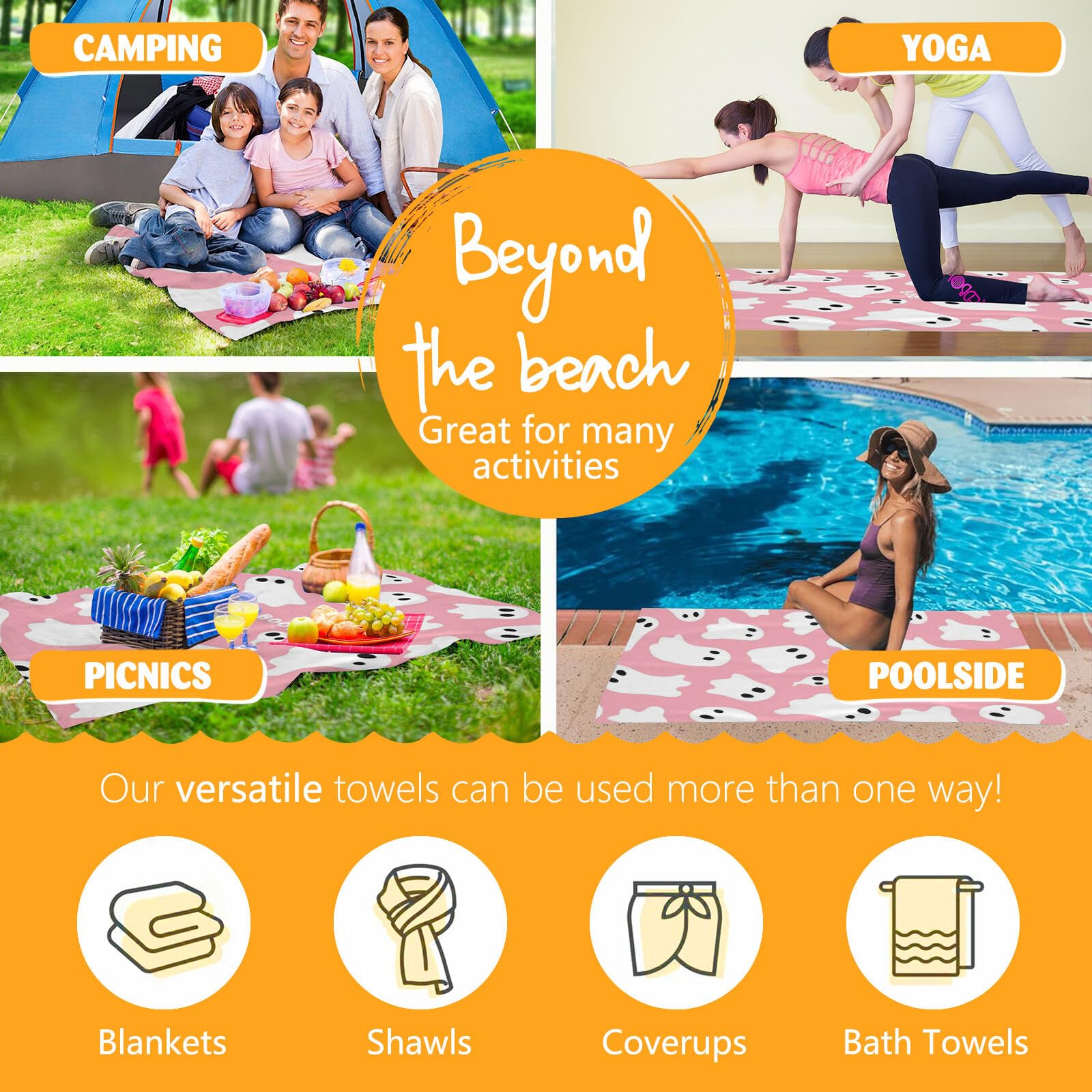 • Soft Microfibre Beach Towels:The Pink Ghost beach towel uses unique ultra-fine fiber fabric, the printing effect is bright and color fast. The fabric has strong water absorption and is fluffy, soft, and skin friendly. Due to its fluffy and soft nature, it can also be used as a blanket.