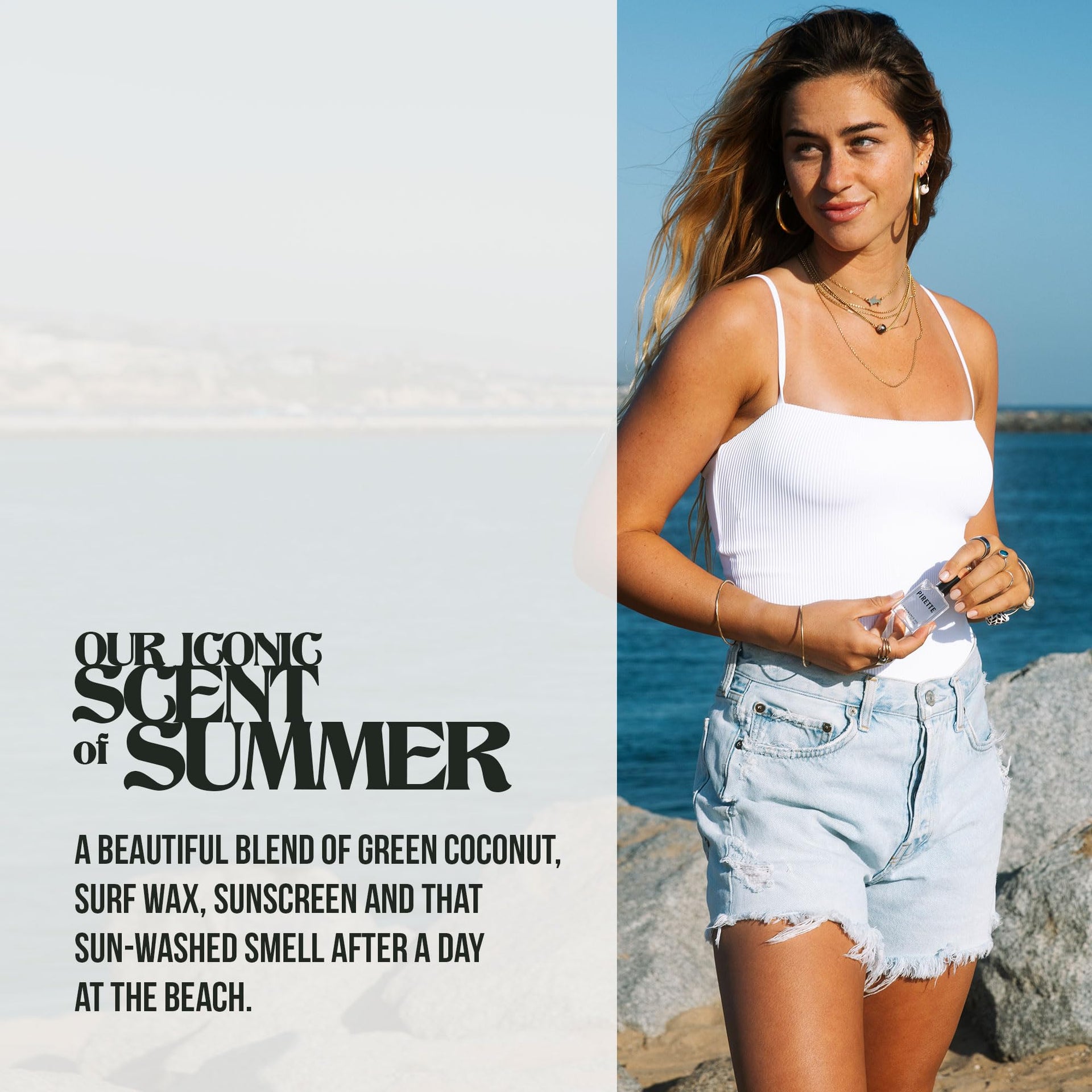 • Fragrance Oil Perfume: Our most coveted scent yet that will whisk you away to paradise with notes of fresh coconut, surf wax and sunscreen. Get your dose of vitamin sea in a perfume roller
