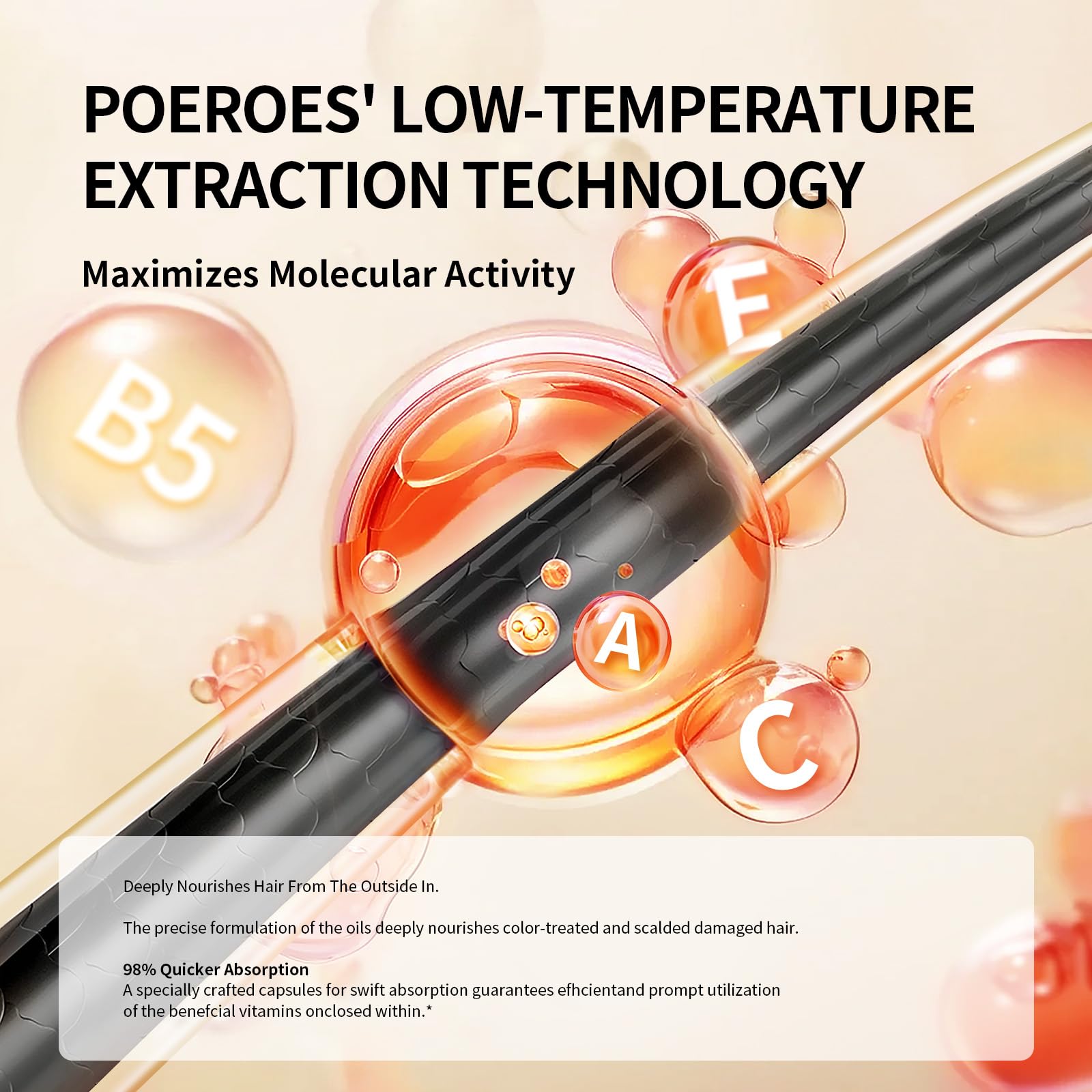 Product name: Poeroes advanced hair care oil Product features: -- Powerful hydrating and repairing formula for damaged hair. -- Contains argan, avocado, oils to restore moisture and reduce frizz. -- Vitamins A, C, E, and B5 provide essential nutrients for strong hair. -- Use as a leave-in conditioner after shampooing for silky, healthy-looking strands. -- Lightweight, absorbs quickly without residue, protects hair from heat styling tools. -- Suitable for all hair types, tames frizz and flyaways, adds shine, and makes hair healthier with continued use. Product parameters: -- Quantity: 50 leave-in serum capsules -- Ingredients:Vitamin A,Vitamin C,Vitamin E,Vitamin B5,Biotin,Sodium.Other Ingredients: Water, Macadamia Oil,Avocado Oil. -- Directions After shampooing, open one capsule and apply to hair. Leave on for 2-3 minutes, then allow hair to absorb or blow dry and style.