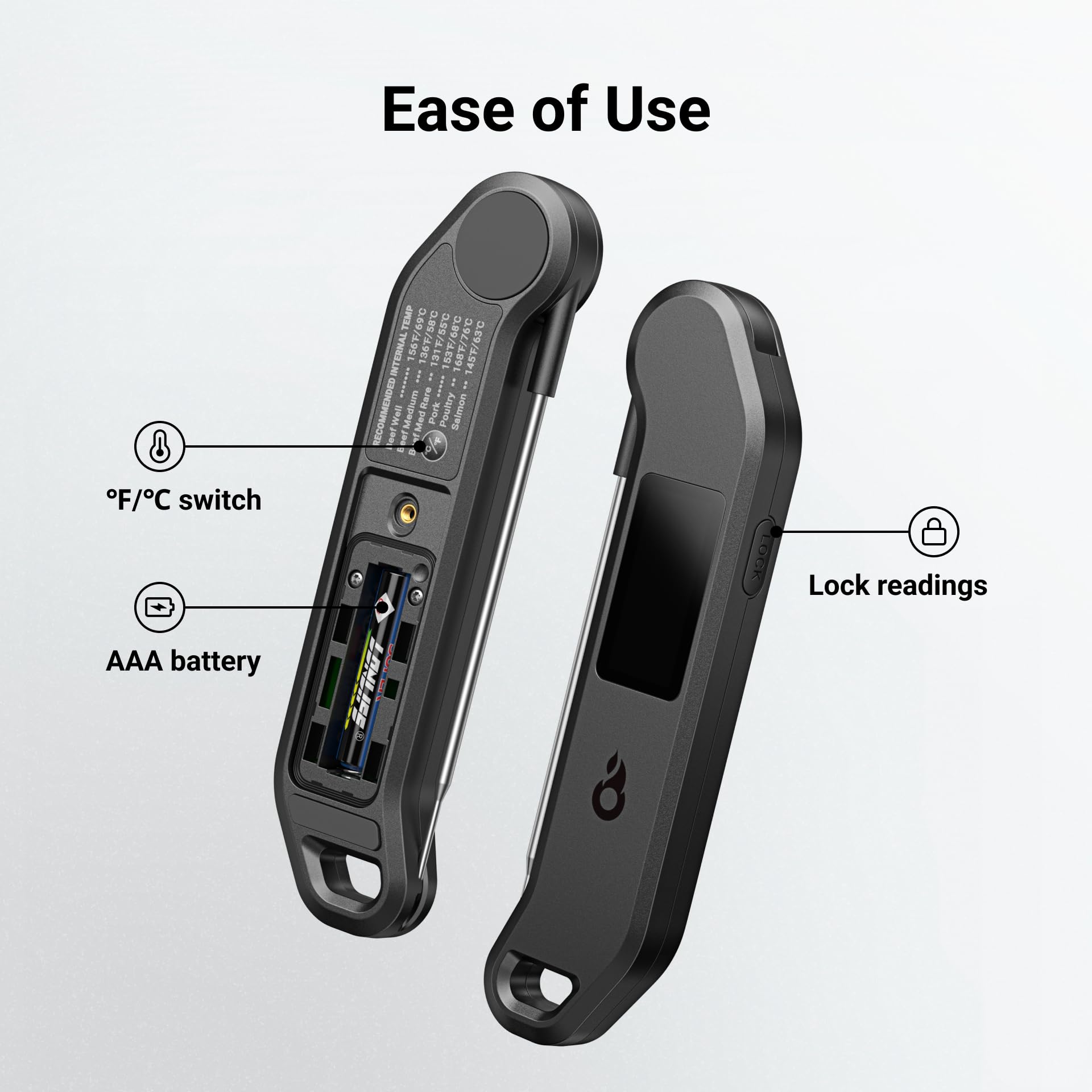 - Motion-Activated, Easier to Use: Built for ease of use and precise performance, this cooking thermometer features a responsive motion-sensing mechanism for quick wake-up and energy-saving sleep. The auto-rotating display makes it accessible for both right-handed and left-handed users, ensuring a comfortable and intuitive cooking experience.