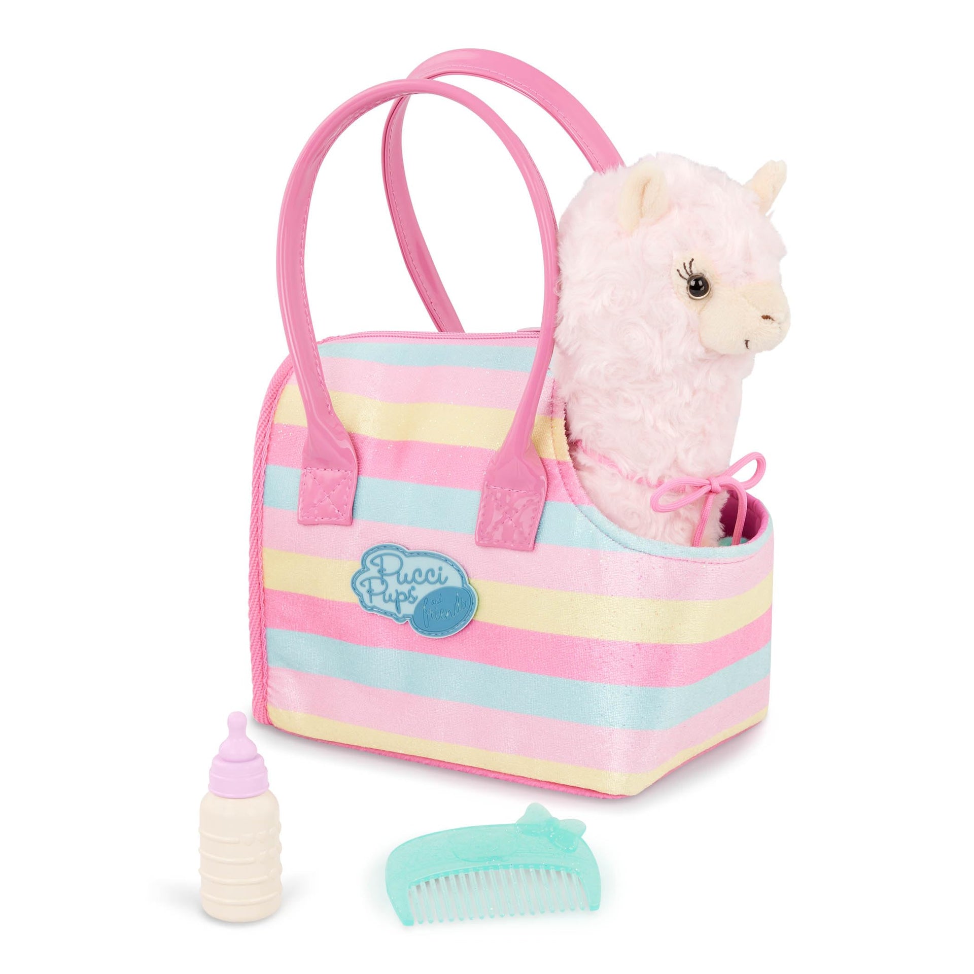 A pet llama? You bet! Dreams come true with the Striped Bag & Llama set from Pucci Pups. This adorable plush llama has incredibly soft pink fur and cute brown hooves, plus it wears a cute and colorful pom pom necklace around its neck. Want to take care of your new friend? Pop the llama out of its stylish handbag by opening the zipper! Then, feed it with the toy bottle and comb its fur with the blue comb. When it’s time for adventures on the go, simply place the llama back in its back and carry it along with you! This lovable toy llama is the perfect gift for kiddos who love animals. The Pucci Pups Striped Bag & Llama is recommended for kids 2 years and up.