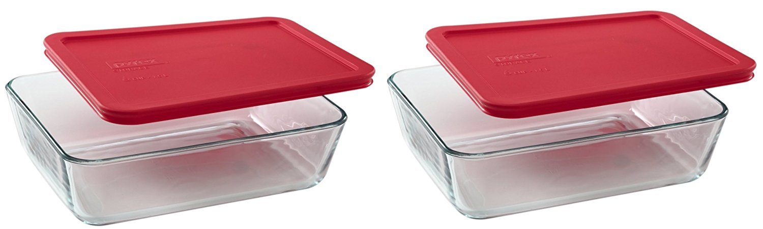 This set includes: (2) 7211 6-Cup rectangular Pyrex dishes and (2) 7211-PC 6-Cup red plastic Pyrex lids. These 7211 6 cup rectangular dishes are made of non-porous Pyrex glass. When paired with the BPA-free 7211-PC red plastic lids, these dishes are great for travel or storage. This dish and lid set will not absorb any food odors, flavors, or stains. The set is also safe for use in the refrigerator, freezer, and microwave and can be easily cleaned in the dishwasher (lid is top-rack safe). These Lids and Vessels are made in the USA.