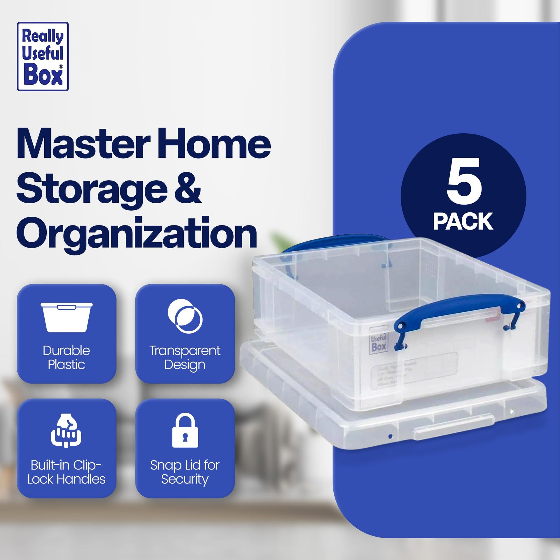 Really Useful Box Stackable 8.1 Liter Plastic Storage Container Bin with Snap Lid & Built-In Clip Lock Handles for Home & Office Organization (5 Pack)