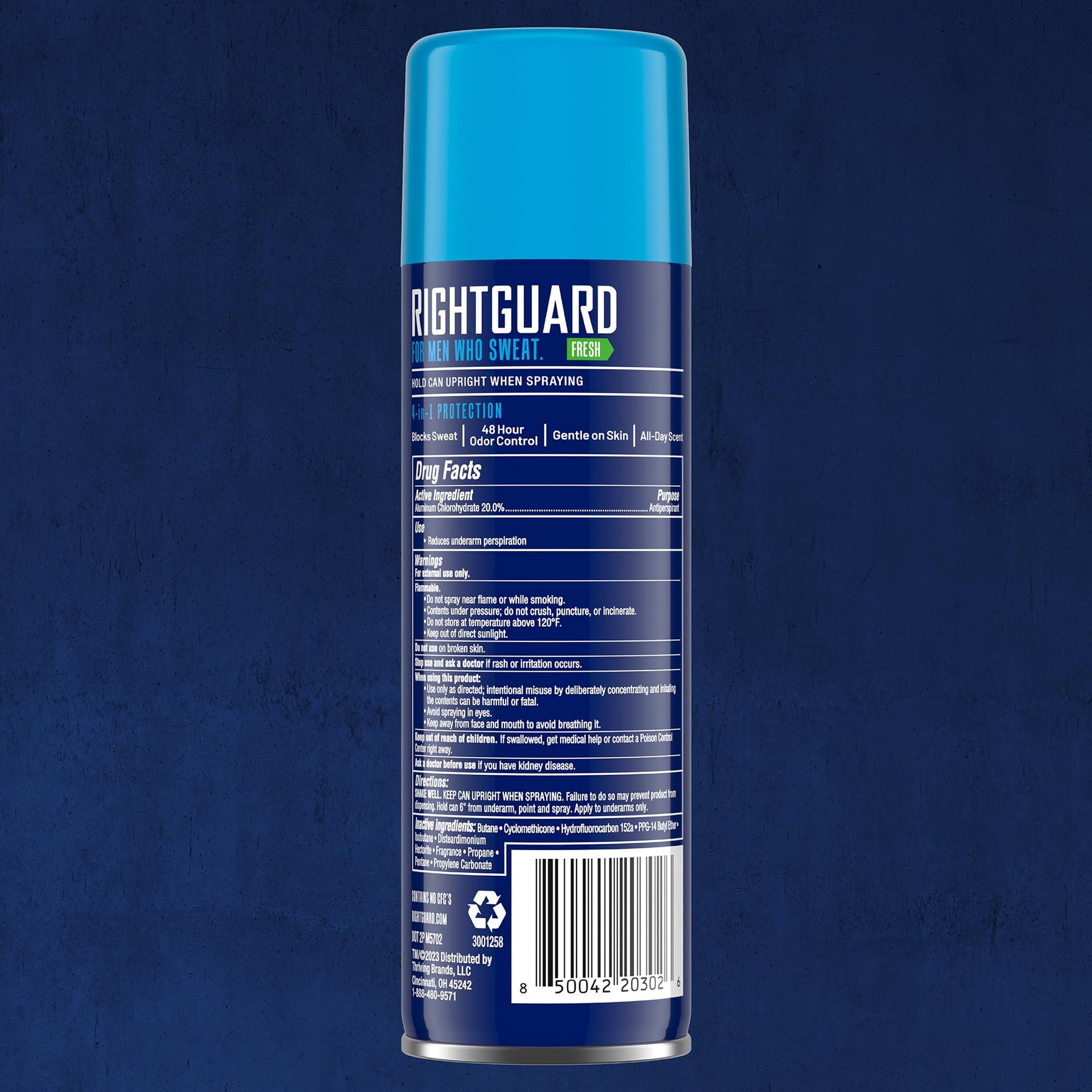 Details: Stay protected, fresh, and confident with Right Guard Sport Fresh Scent Antiperspirant & Deodorant Spray. This 6oz spray is engineered with 4-in-1 protection to combat sweat, odor, bacteria, and wetness—giving you complete coverage whether you’re on the job, at the gym, or off the clock. Formulated for men who give 110%, this hardworking deodorant and antiperspirant blocks sweat on contact and helps you stay dry under pressure. With 48-hour odor control, it works overtime so you can push harder, go longer, and stay focused—without having to reapply. The fresh, clean scent keeps you smelling great with its quick-drying formula. And because it’s gentle on skin, you get all the protection you need- without irritation. Just spray and go. With over 60 years under our toolbelt, Right Guard continues to deliver the strength, reliability, and innovation men count on. Right Guard Sport Fresh Scent Spray - for men who sweat.