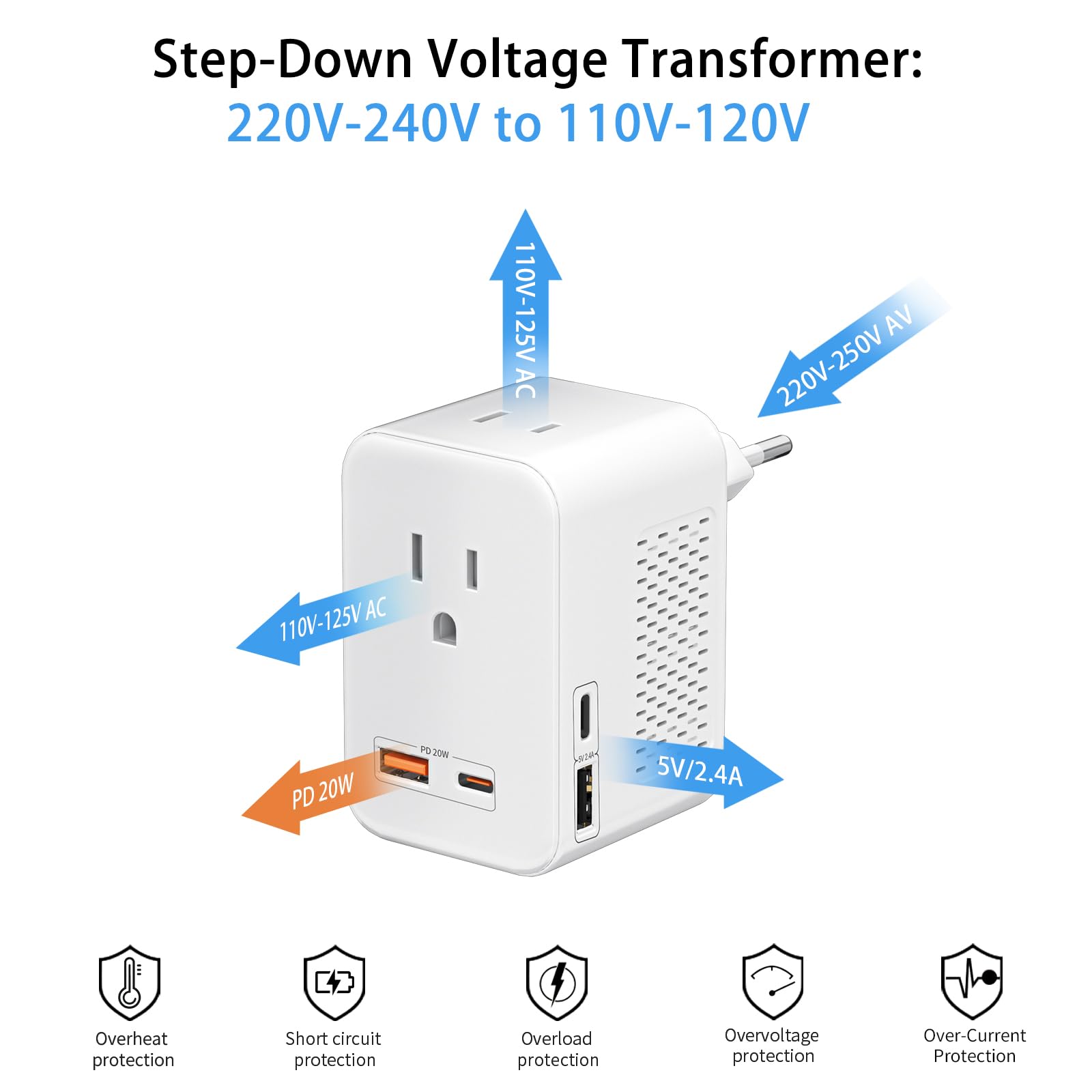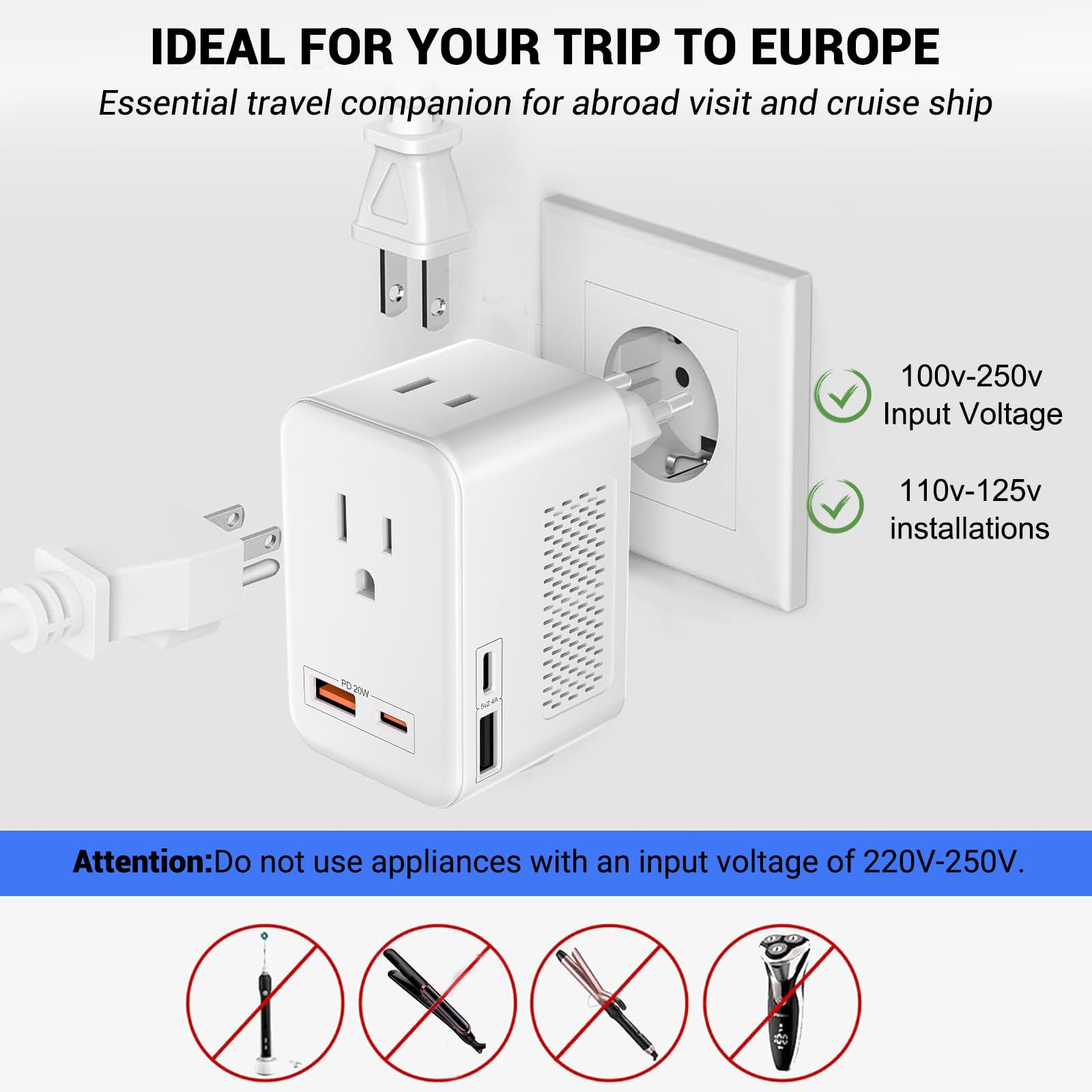 - voltage converter us to europe: Can be used for 25W-1400W (110V-120V) power equipment in European 110V-250V countries. (Please do not use high power appliances over 1400W).