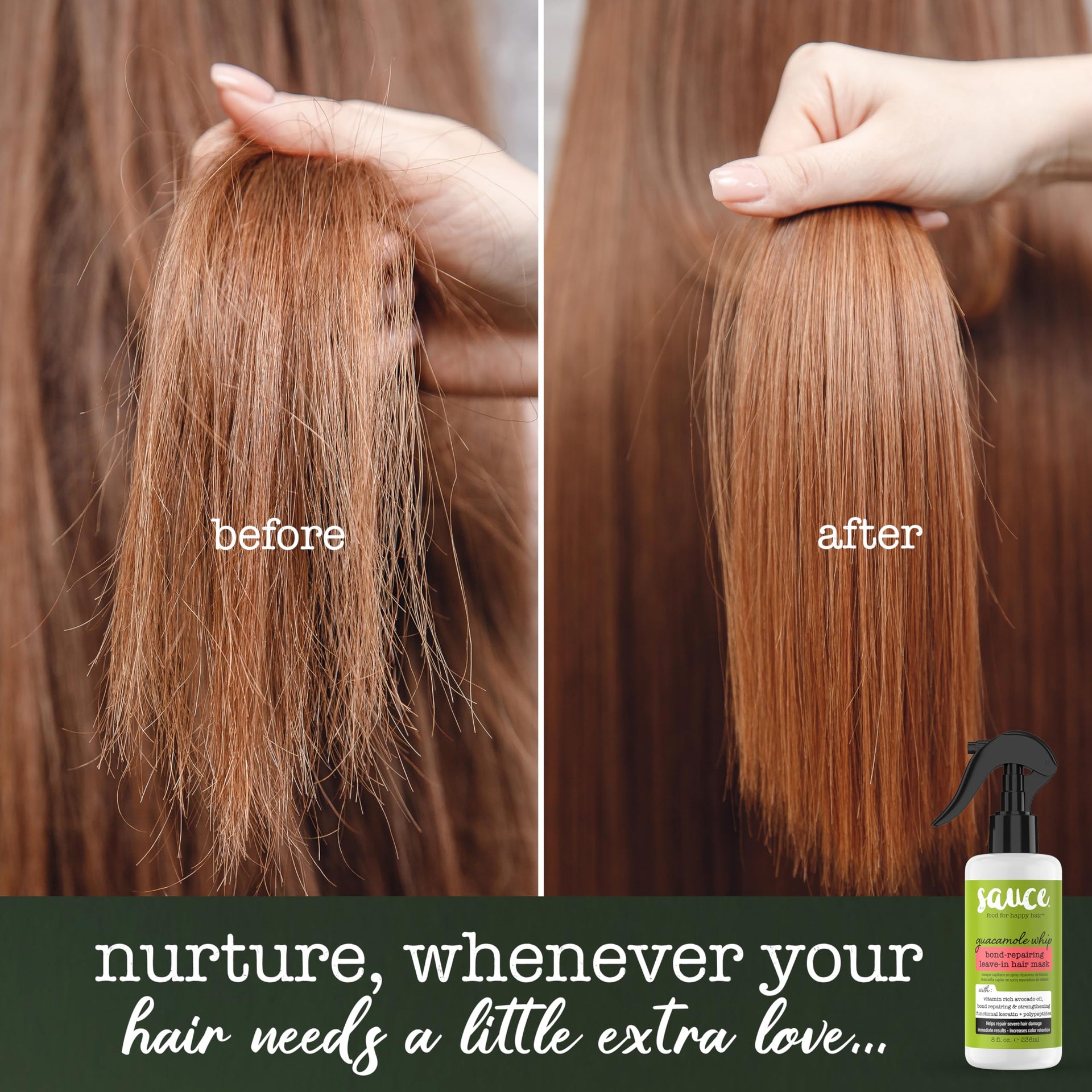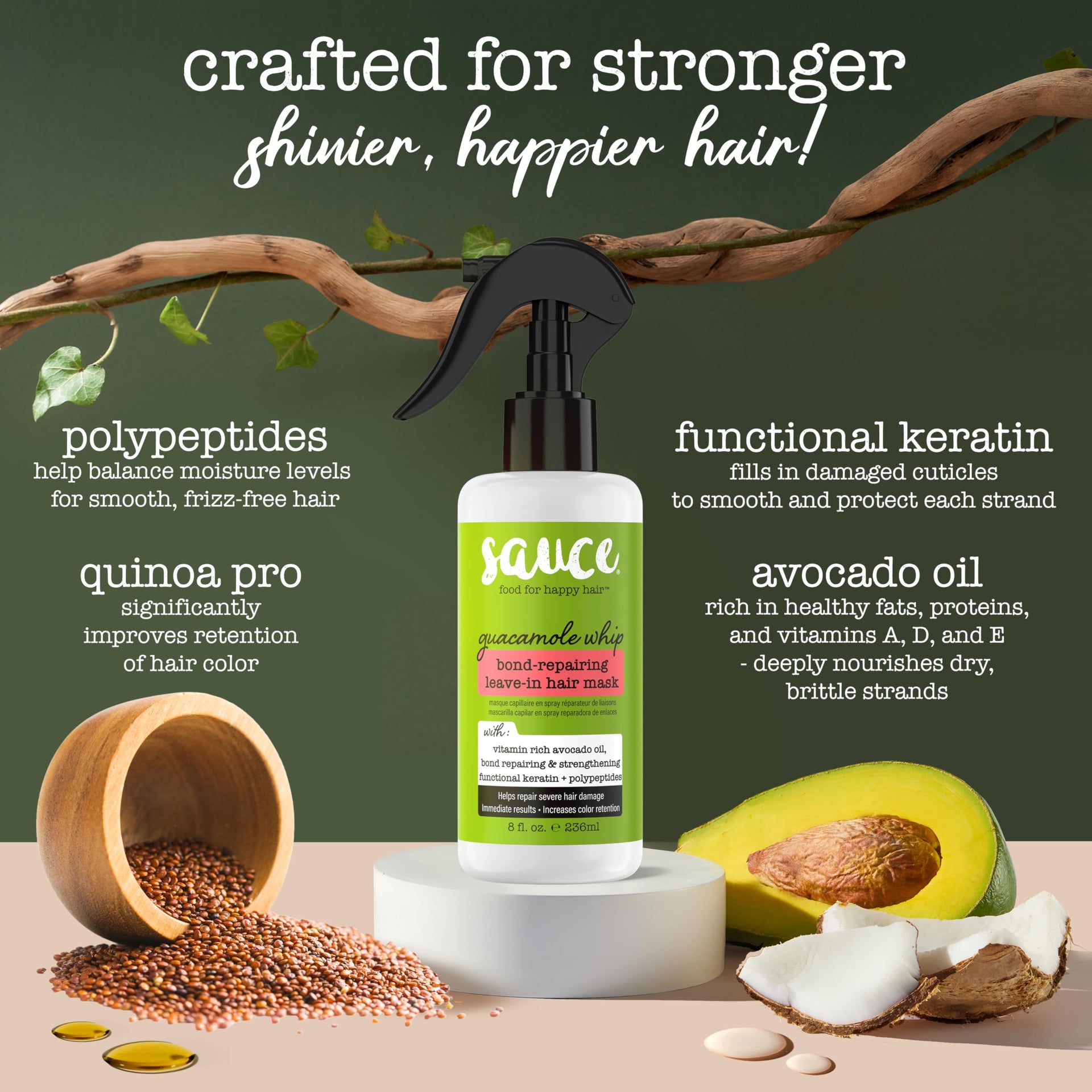 SAUCE BEAUTY Guacamole Whip Bond Repairing Leave-In Hair Mask Treat your hair to the care it deserves with Sauce Beauty's Guacamole Whip Leave-In Hair Mask. This nourishing hair mask is infused with an array of nourishing ingredients designed to repair damage and improve color retention. Avocado oil, polypeptides, quinoa pro and functional keratin work together to provide advanced bond repair, restoring your hair’s strength and resilience. Essential oils further enhance this potent formula, delivering deep hydration and a boost of nutrients for healthy, shiny locks. Simply apply from roots to tips on damp hair, wait for up to 5 minutes, and style as usual-no rinsing required. Use after every hair coloring, bleaching, or after using hot styling tools. Sauce Beauty haircare products are inspired by iconic and delectable recipes from kitchens around the globe. We craft formulas with proven ingredients and fragrances you’ll love. Just like you want to know ingredients of the best foods, we created TransHAIRency to tell you everything that goes into our products and what they’re used for. Get your hair on the Sauce!