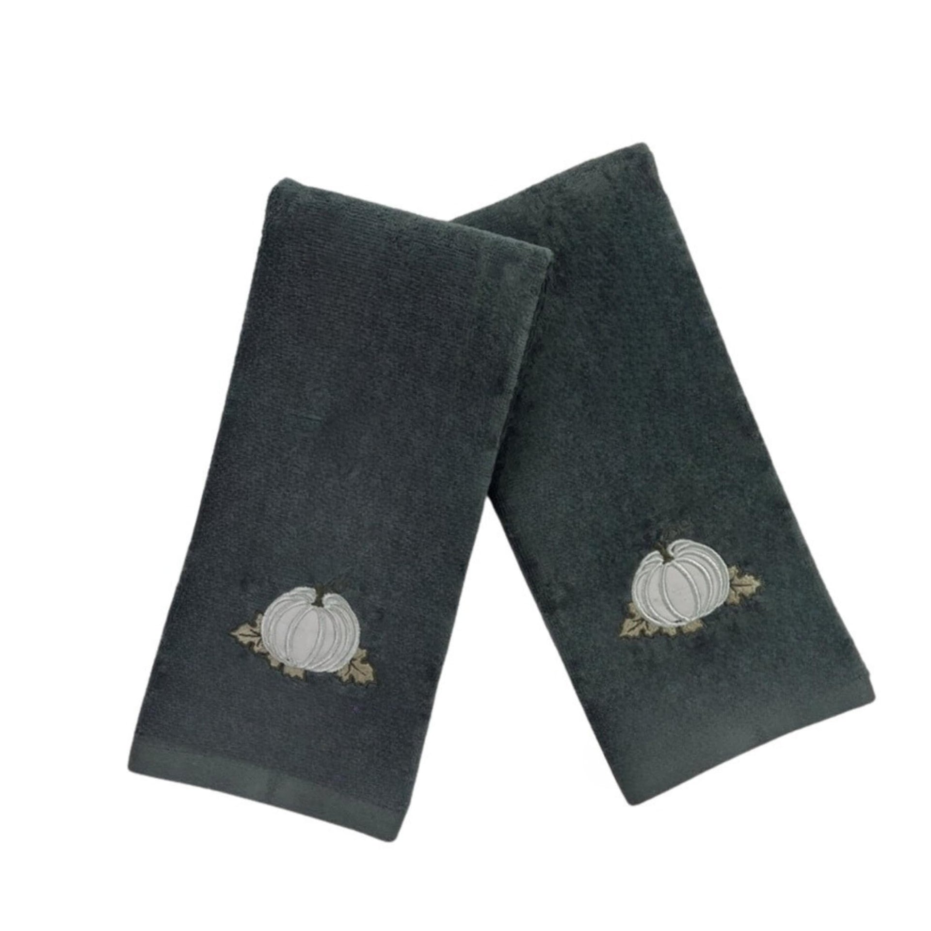 Transform your bathroom into a cozy autumn sanctuary with these elegant hand towels from Serafina Home. Each towel in this set of two measures 16 x 25 inches and is crafted from premium 100% cotton, offering both luxurious softness and excellent absorbency. The sophisticated grey color is beautifully adorned with a carefully embroidered white pumpkin motif and golden leaf accents, creating a perfect harvest-themed accent piece. The plush cotton construction provides a substantial feel while remaining gentle on your skin. These decorative towels strike an ideal balance between functionality and style, making them perfect for everyday use or seasonal display. The farmhouse-inspired design adds a touch of rustic charm to your bathroom decor, while the neutral color palette ensures they complement various interior styles. Whether displayed on a towel bar or arranged as part of your fall decor, these hand towels bring both practical utility and seasonal charm to your space.