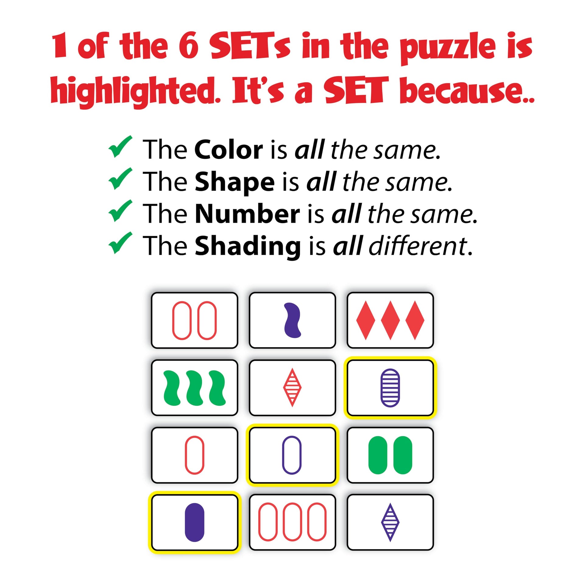 • EASY TO LEARN GAME: Race to make the most SETs by matching colors, shapes, shadings, or number of shapes on the cards. They have to be all the same or all different
