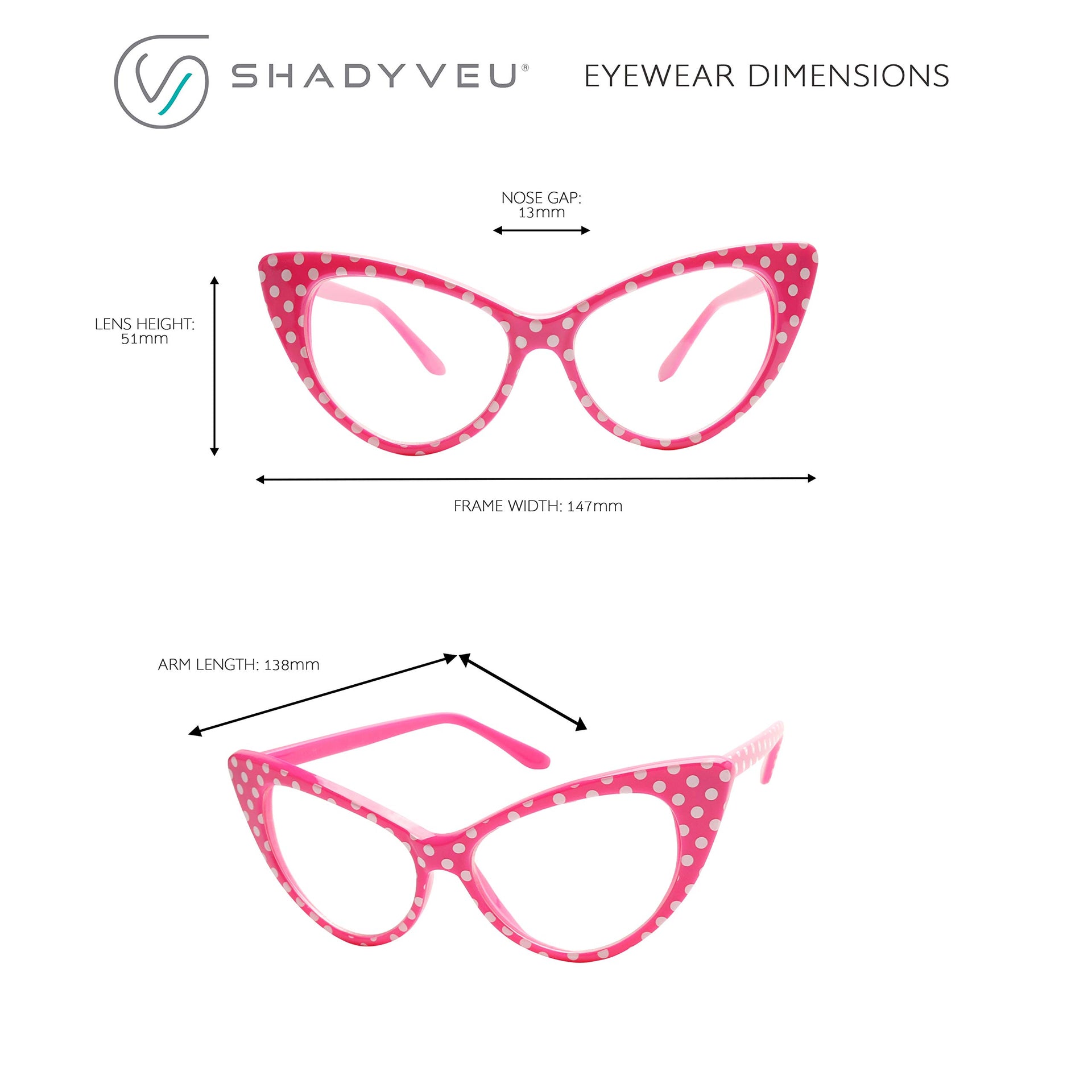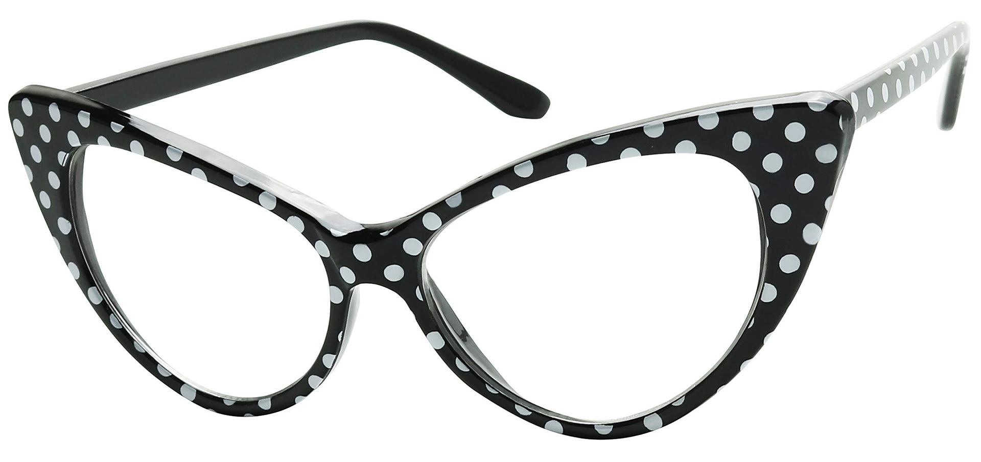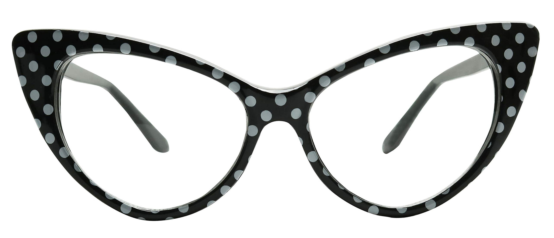 • Vintage sunnies: Designer inspired cute polka dot cateye eyeglasses that can be used as an Rx / prescription frame, fashion eyewear accessory or as a costume prop for Halloween or cosplay outfit. With it's large exaggerated pointy cat eye style, this frame will fit for all purposes especially if you're rocking that 1950's vibe.