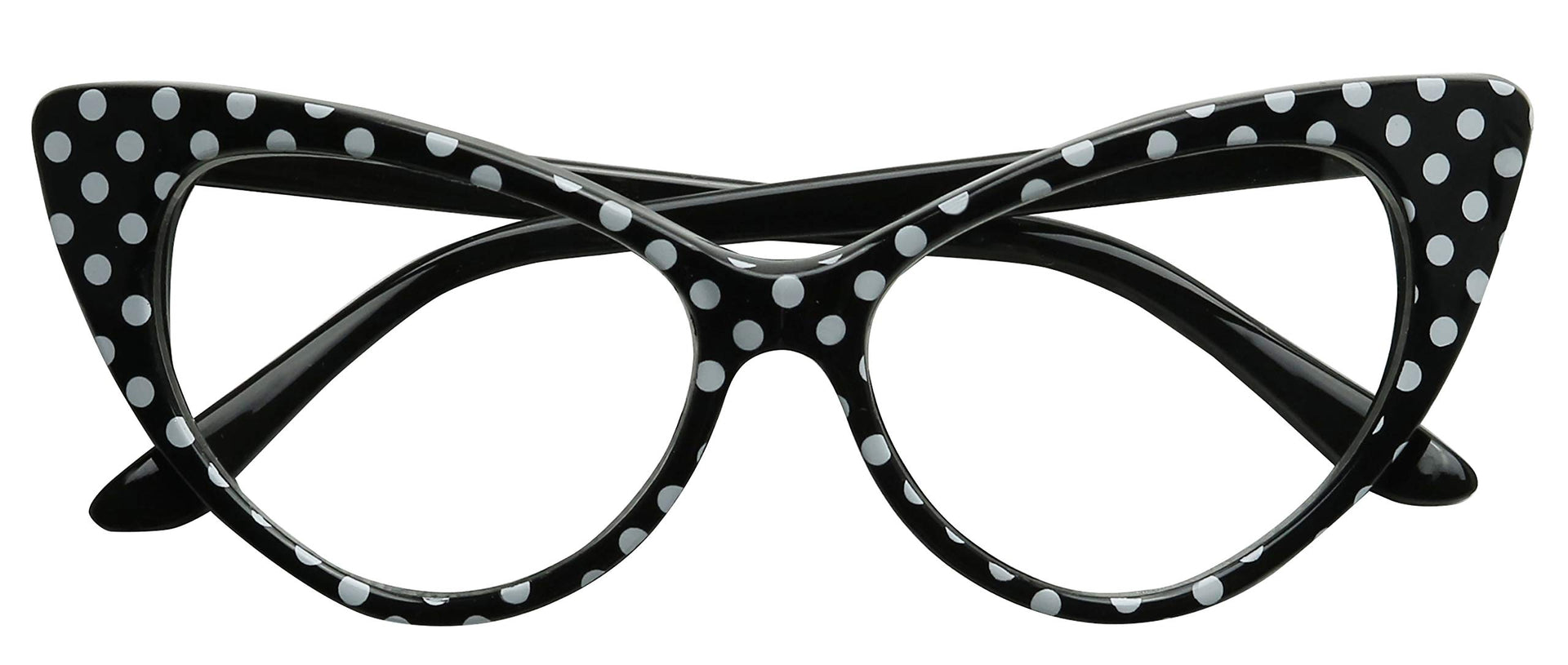Bring back flashback friday’s with our 50’s inspired super cute high pointed polka dot cat eye clear lens eyeglasses. These oversized exaggerated pointy glasses can add life to any eyewear prescription by having them fitted with your zoom values in your optometrist office. Also great for everyday use without the need for prescription since the lenses are fully protected with UV400 coating against the suns harmful rays. Due to its high quality craftmanship and durability, this item has received high ratings and is vastly recommended. The frames feature a timeless polka dot pattern that can easily be used for any outfit and even costume. These frames have been used for cosplay costumes, Bob’s Burger costume, Wendy Peffercorn costume, 1950’s retro oldies costume and Linda Belcher costume, just to name a few . The lens are clear but they do provide full protection from the sun, remain protected and fashionable The cat eye frames are more than just a fashionable, stylish frame, they represent attitude and complete confidence with their sexy high pointed tip temples.