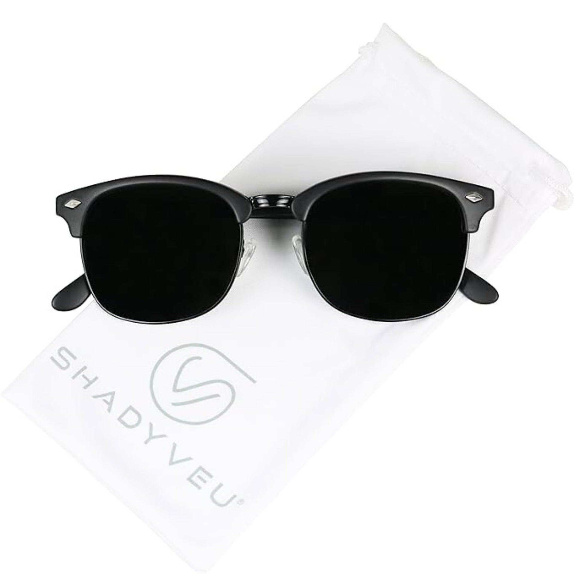 A truly exclusive eyewear style that only comes from ShadyVEU's line of exquisite eyewear. Relive the classic with our vintage style, half rimmed sunglasses. They're sleek and classy, and is definitely a must have accessory. These semi rim 60's inspired sunnies feature Super dark lenses sunglasses. And when we say super dark, we mean Super dark. Great for extra sunny days, migraines and even cataract surgery post op. Equipped with comfort english nose pieces and 100% UVA and UVB polycarbonate lenses.