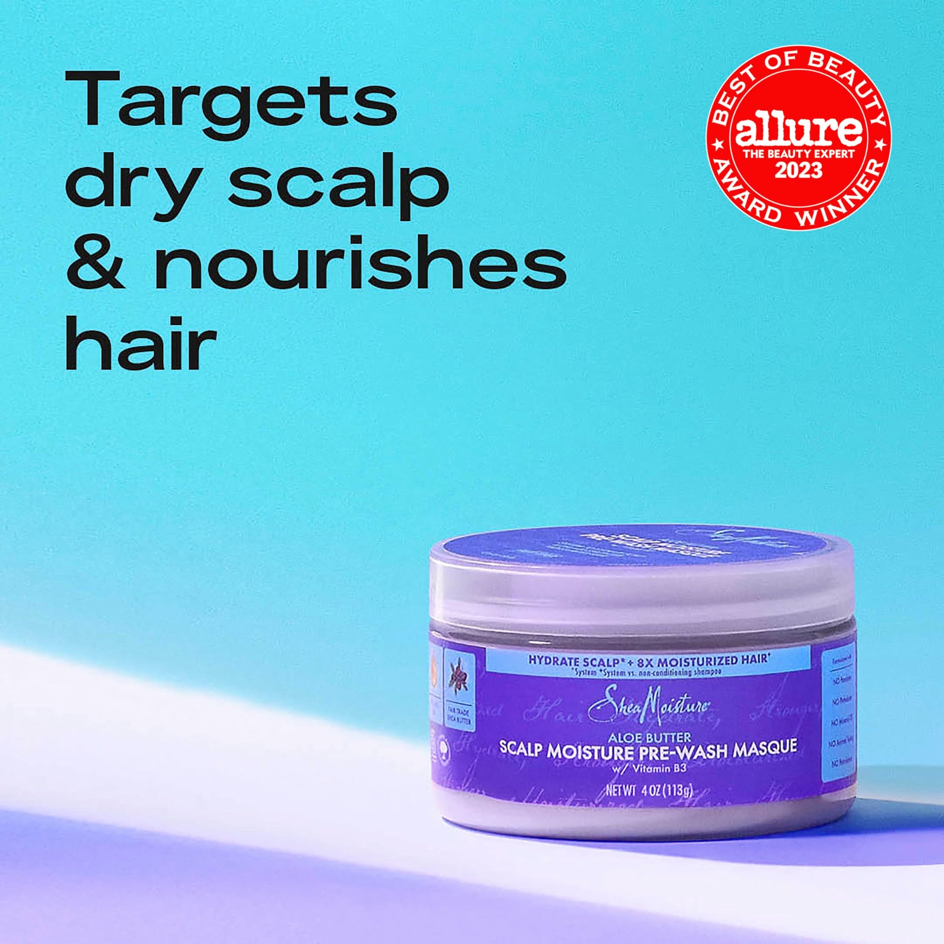 Start with a boost of hydration! SheaMoisture Scalp Moisture Pre-Wash Masque, infused with Aloe Butter and Vitamin B3, provides extra nourishment to help restore hydration to your dry scalp and hair. Our Aloe Butter hair care system, formulated with Fair Trade Shea Butter, leaves hair 8x* more moisturized and 4x* stronger. * vs. non-conditioning shampoo This deep conditioning masque targets your dry scalp to restore hydration and nourish hair before shampooing. When used together, with our shampoo and conditioner, this SheaMoisture hair masque moisturizes and strengthens for less breakage and healthy-looking hair. SheaMoisture is known and loved for its sustainably produced goodness. It's made with love for you. Like all of our hair care products, this pre-wash masque is formulated with no parabens, no phthalates, no mineral oil or petrolatum and has been tested on our family for generations and never on animals. Our Story: SheaMoisture is the legacy of Sofi Tucker, a pioneering mother of four and entrepreneur, who sold Shea Butter, African Black Soap and homemade beauty preparations in Sierra Leone in 1912. We honor her vision by continuing to formulate with Shea Butter handcrafted by women in Africa. With every purchase, you show support of our mission to reinvest back in our communities.Allure Best of Beauty award winner 2023.