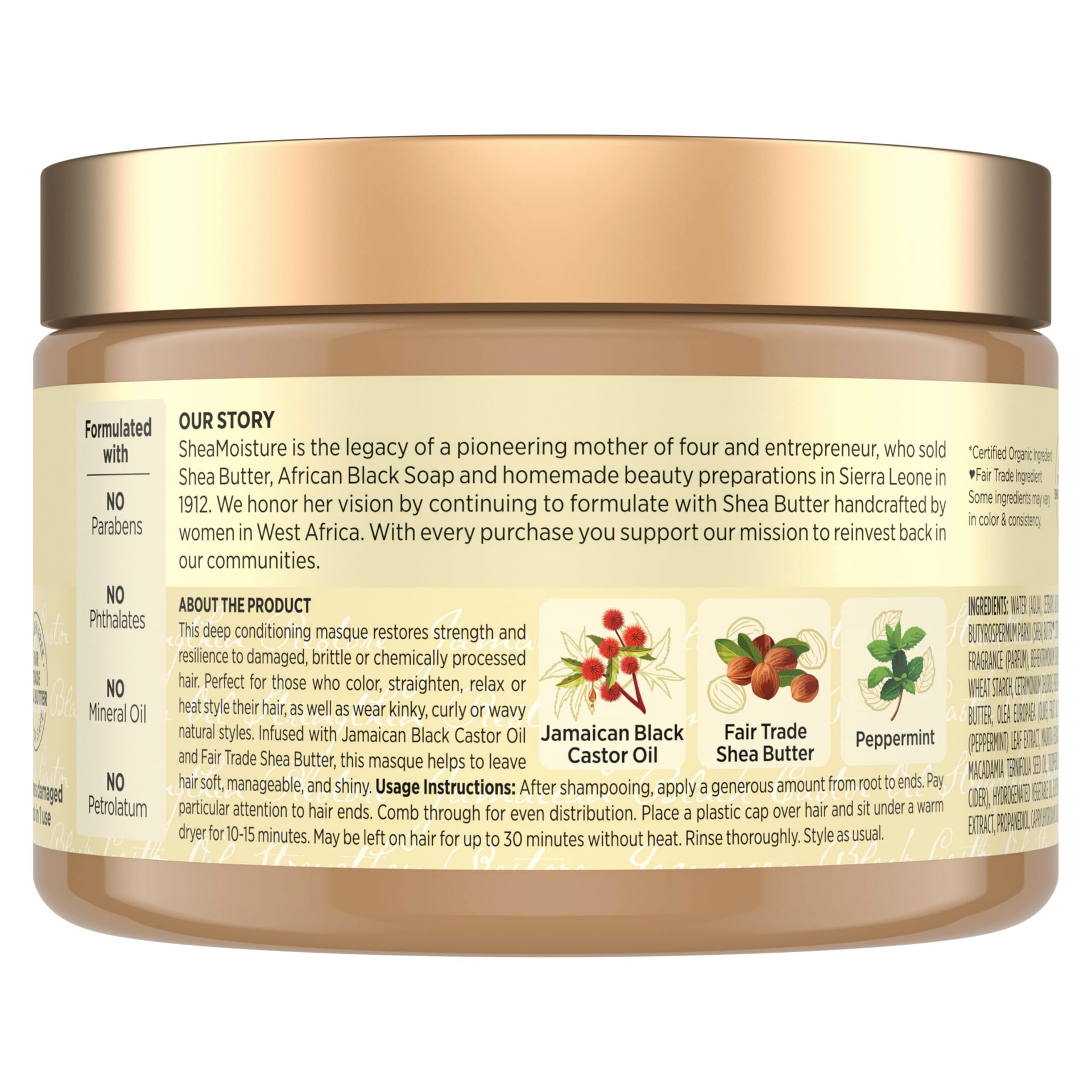 SheaMoisture Jamaican Black Castor Oil Strengthen and Restore Masque is a deep conditioning and hydrating hair mask that helps to strengthen and restore damaged or chemically processed hair. This hair mask and deep conditioner replenishes moisture and softens hair by supporting elasticity, reducing the appearance of breakage and shedding; it's our best hair mask for curls. Our deep conditioning hair mask is perfect for those who regularly color, straighten, perm or heat style their natural hair. Formulated with Jamaican Black Castor Oil and Shea Butter, this deep conditioner hair masque strengthens damaged hair and chemically processed hair. All SheaMoisture hair products are sustainably produced and cruelty-free. This SheaMoisture hair mask is formulated with no silicones, no sulfates, no parabens, no phthalates, or petrolatum. These hair products, including this hair masque by SheaMoisture, have been tested on family and friends for generations and never on animals. Our Story: SheaMoisture is the legacy of Sofi Tucker, a pioneering mother of four and entrepreneur who sold Shea Butter, African Black Soap and homemade beauty preparations in Sierra Leone in 1912. We honor her vision by continuing to formulate with Raw Shea Butter handcrafted by women in Africa. With every purchase you show support of our mission to reinvest back in our communities.