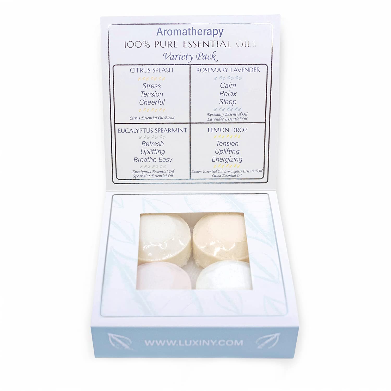 • YOU DESERVE ONLY THE BEST. Luxiny shower steamer's aromatherapy benefits are immense. We infuse each vapor shower tab with more than 22 droplets of premium essential oil for maximum long-lasting aroma. This variety pack includes one tablet of each of the following scents: Rosemary Lavender, Lemon Drop, Citrus Splash, and Eucalyptus Spearmint.