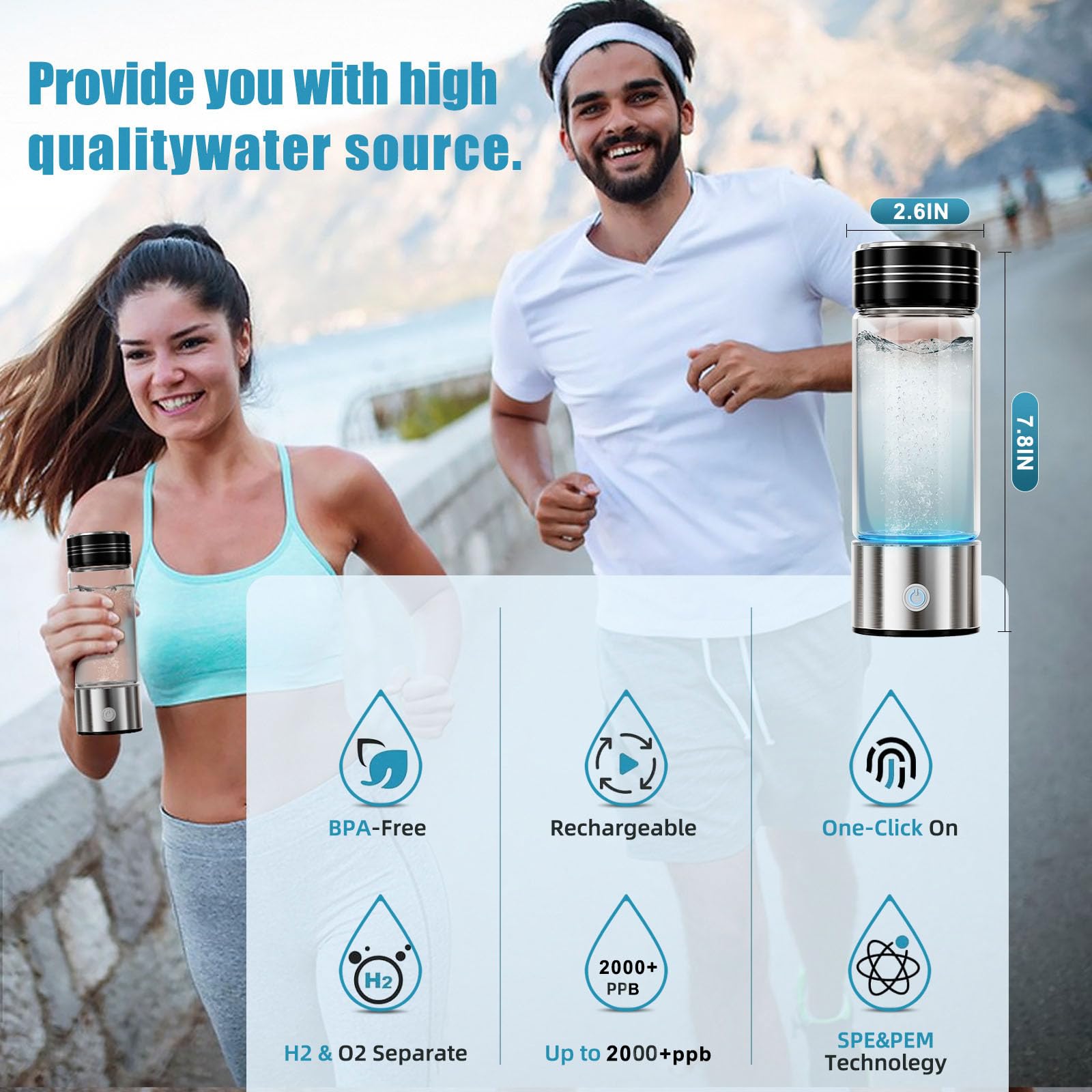 SignZap Hydrogen Water Bottle, 15oz Rechargeable Glass Hydrogen Water Bottle Generator,Produces 2000PPB antioxidant Hydrogen Water in 3 Minutes,Ideal