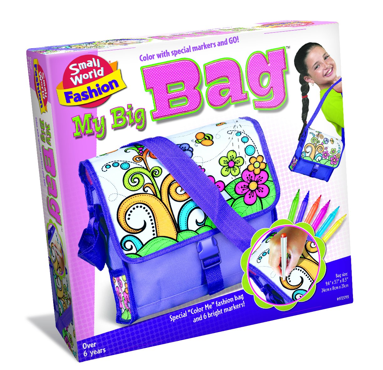Design and color My Big Bag! Special "color me" fashion bag and 6 bright markers. Use the special fabric markers to fill in the preprinted fashion bag. Bag size: 10"W x 3.5"D x 9.5". Over 6 years. For over 50 years, Small World Toys has delivered fun, safe, innovative and endearing products for children of all ages.