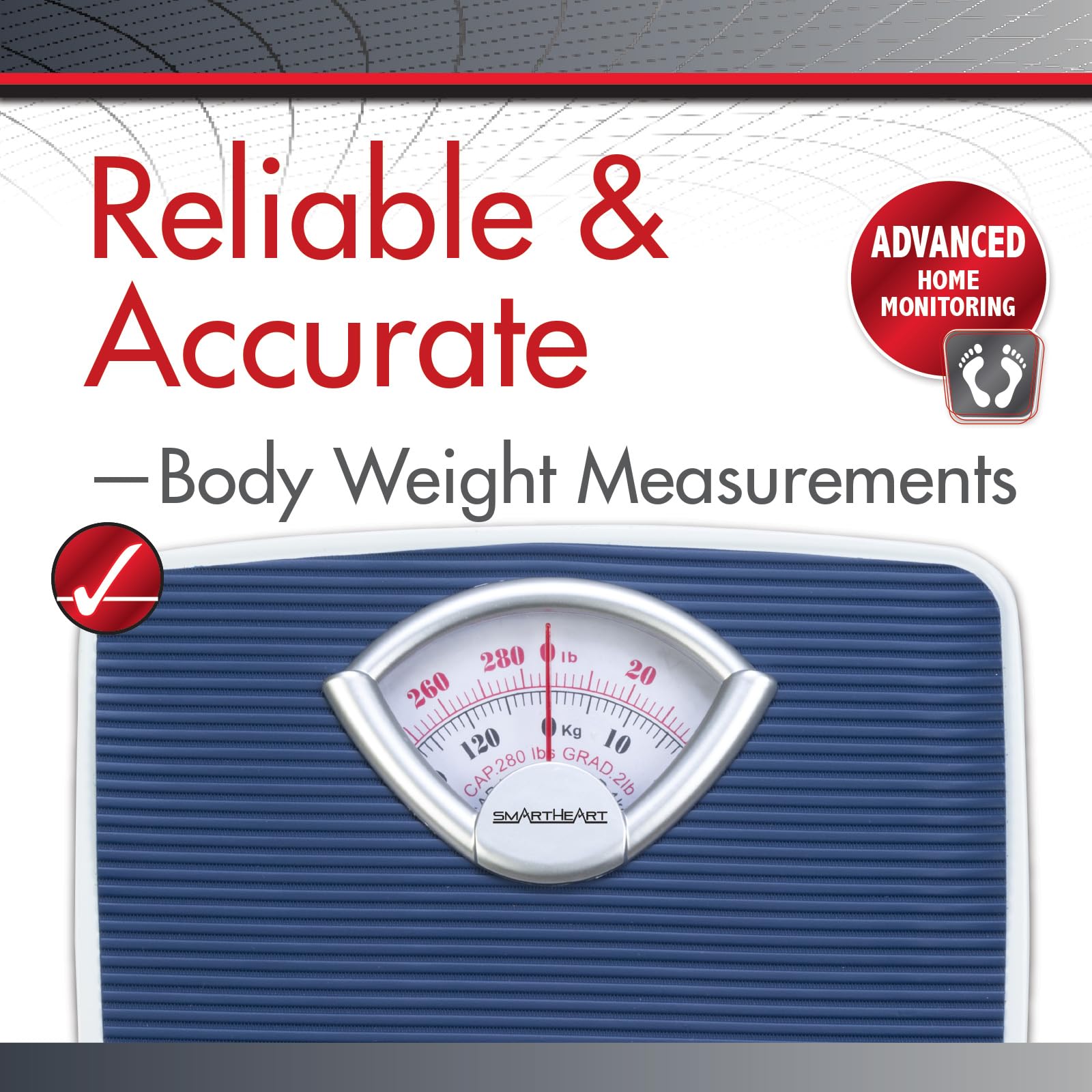 The SmartHeart Analog Body Weight Scale offers reliable, battery-free performance with a 286 lbs / 130 kg capacity, perfect for daily weight tracking. Featuring a large 10.5” x 10.5” non-skid platform and a clear 3.5” x 2” dual-unit display in pounds and kilograms, this mechanical scale is easy to use and built for accuracy. With simple dial calibration, no batteries required, and a 1-year limited warranty, it’s ideal for health-conscious individuals looking to monitor weight, support fitness goals, and manage diet plans effectively.