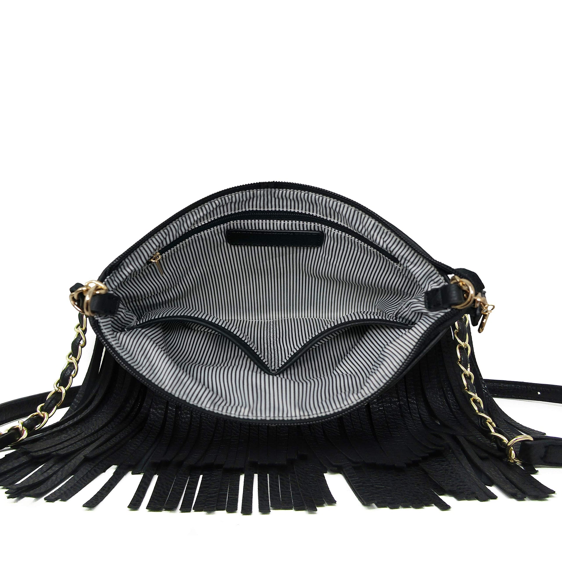 - Separate compartment - 1 inside zipper pocket to hold it securely and 2 inside open pockets to keep small essentials easy access. And top zipper closure. Fringe crossbody purse interior side pockets are perfect for small essentials like wallet, phone, keychain, lipstick, cash, credit cards, ID.