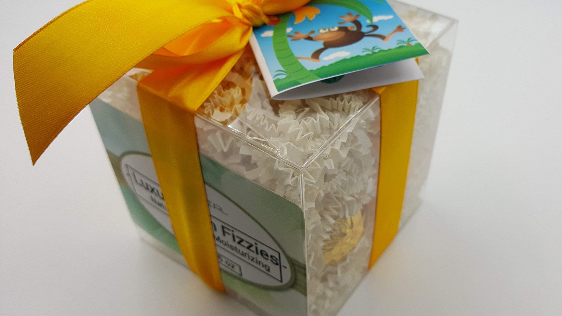 Our Gift Set with 6 bath bombs (2.25 Oz each) individually hand wrapped in colorful foils to preserve freshness. Select from over 100 fragrances...all best-selling scents and enjoy a relaxing bath as you soak. Spa Girl bath bombs are made with skin moisturizing ingredients with Shea, Mango & Cocoa Butter that moisturizes and replenishes your skin. Bathing with bath bombs is far better than lotion. The body's oils will lock in the skin all-natural moisture are 100% pure and natural ingredients, and many oils are Kosher too. Our 2.25 Oz bath bombs are about the size of a golf ball, 2 inches in diameter. In this gift set you will receive 6 bath bombs in a clear gift box with a hang tag and coordinating ribbon— great fun for kids.