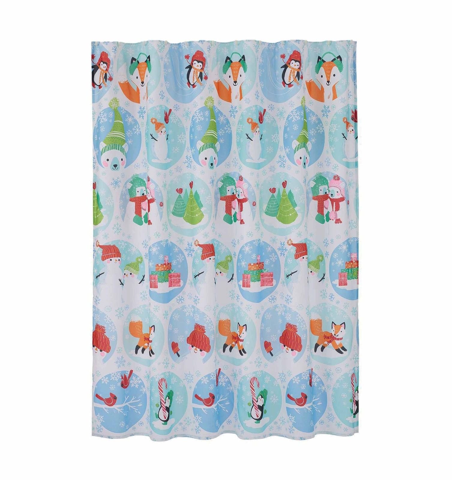• HOLIDAY SHOWER CURTAIN - Features a winter pattern of foxes, penguins, snowmen, polar bears and more on a snowy background. Stacks of presents and the animals are all shown in circles with alternating shades of blue in the background.