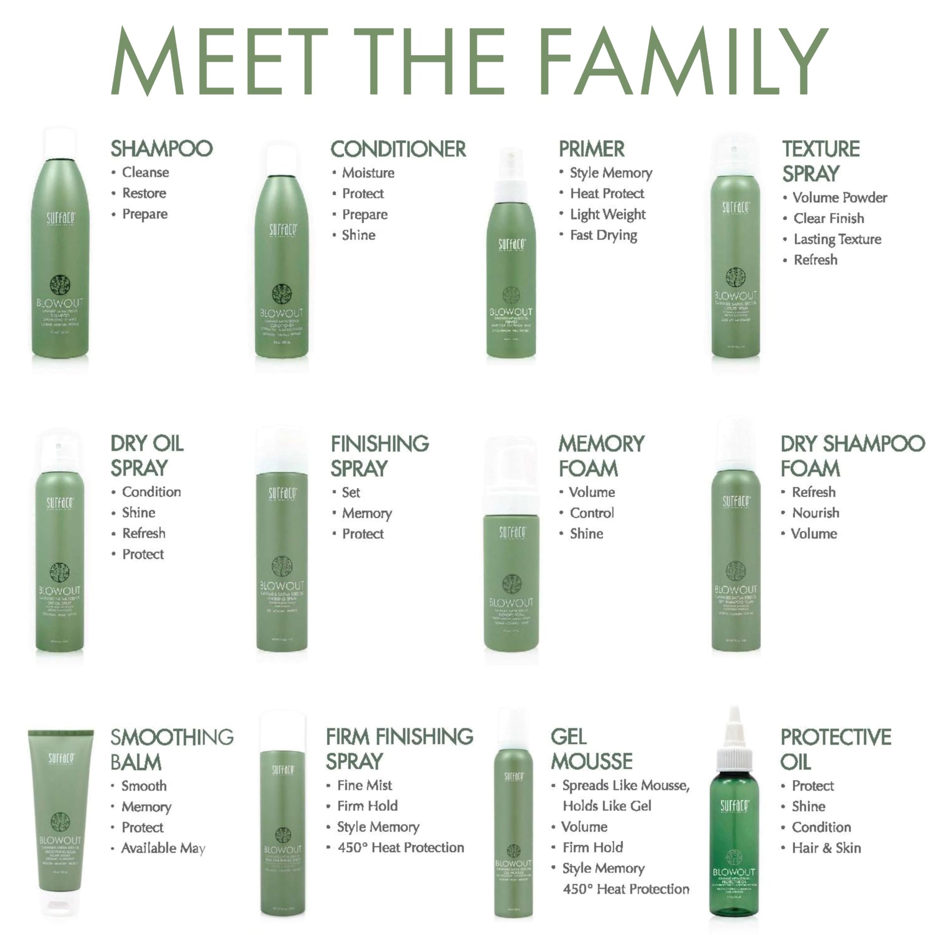• Surface Blowout line are made with ingredients that create a long-lasting moisture barrier and 450-degree Heat Protection for conditioned, bouncy hair that lasts for days on end.