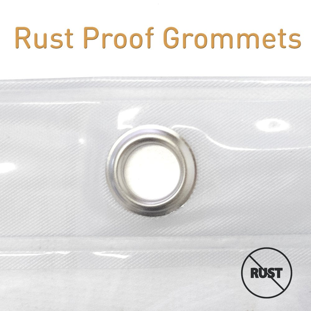 It has a 24-inch see-through top, is tear-proof, and has rustproof aluminum grommets for standard curtain hooks up to 0. 25-inch diameter. Machine washable, this curtain is made with 10-gauge vinyl and measures 72 or 84 inches long.
