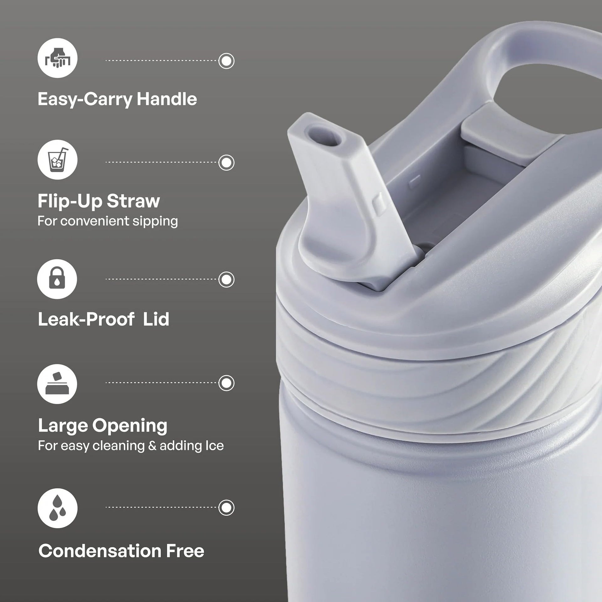 Stay hydrated in style with this premium 26 oz water bottle, featuring thoughtful design elements that make it perfect for everyday use. The leak-proof lid comes equipped with a convenient flip-up straw for easy sipping on the go, while the easy-carry handle ensures comfortable transport wherever your day takes you. With its generous 3¼ cup capacity and large opening, adding ice and cleaning is a breeze. The sleek gray design remains condensation-free, keeping your grip secure and your belongings dry. Weighing just 0.94 lbs and measuring 2.99 inches in diameter, this bottle strikes the ideal balance between capacity and portability. The durable construction and practical features like the secure lid make it an excellent companion for the gym, office, or outdoor adventures. Keep your beverages at the perfect temperature while enjoying the functional design that prioritizes both performance and convenience.