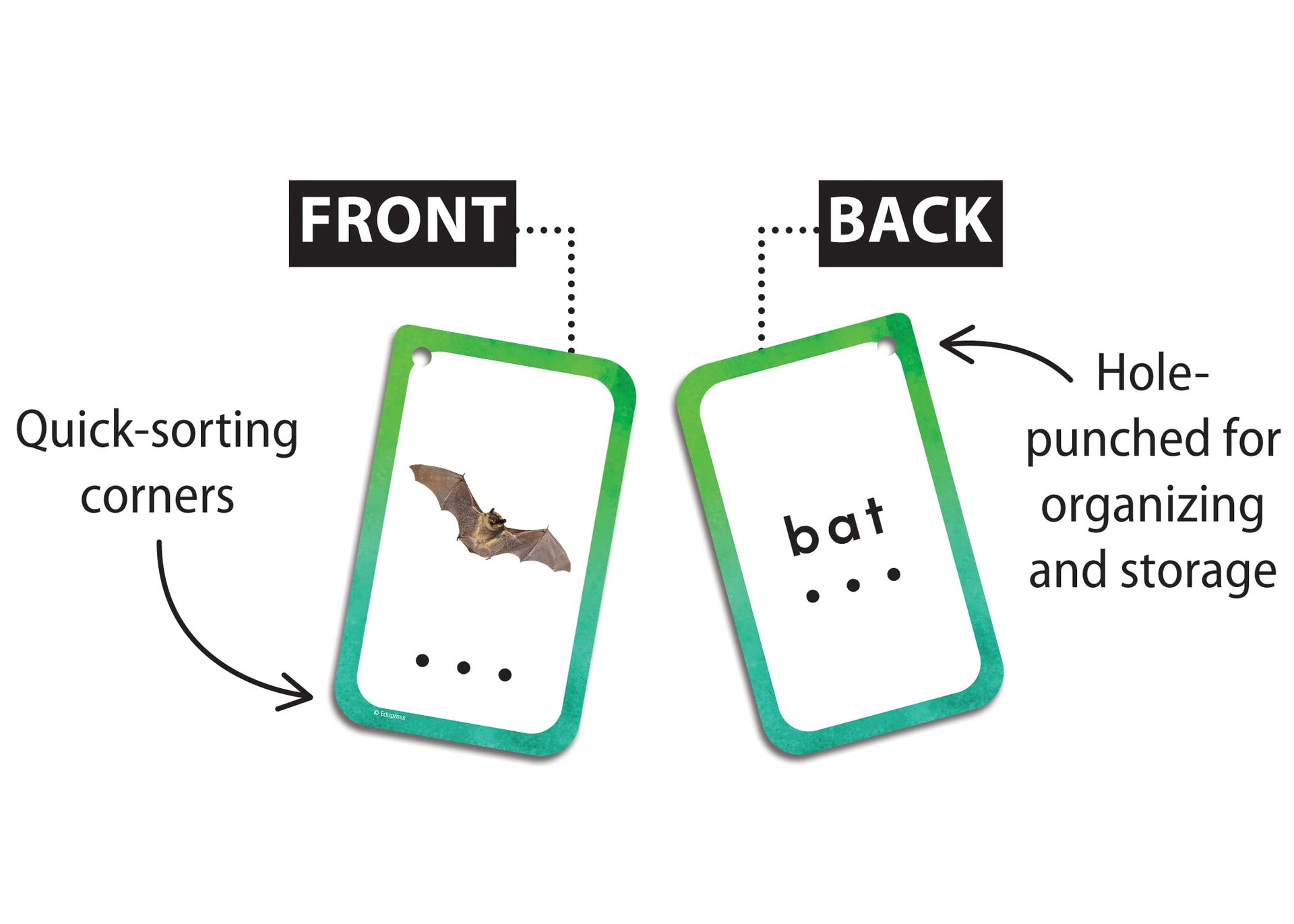 Details: Each flash card set contains a collection of full-color, high-interest student cards as well as instructions and tips for the teacher or parent, suggested activities, and additional blank cards. Each card has a hole in the top corner that can be fit with a ring or string to help with organization and storage. Additionally, each card has one corner that is shaped differently than the others. By lining up the non-rounded corners, the flash cards can quickly be faced in the same direction.