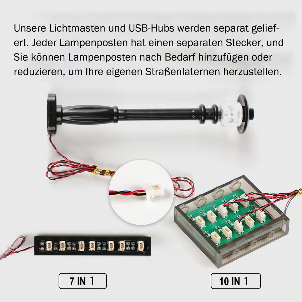 - Big extension: The USB hub cable is 60 cm long, and each lamp post has a 40 cm cable. By using ultra-fine cables, they can be hidden in building blocks without compromising their original appearance.