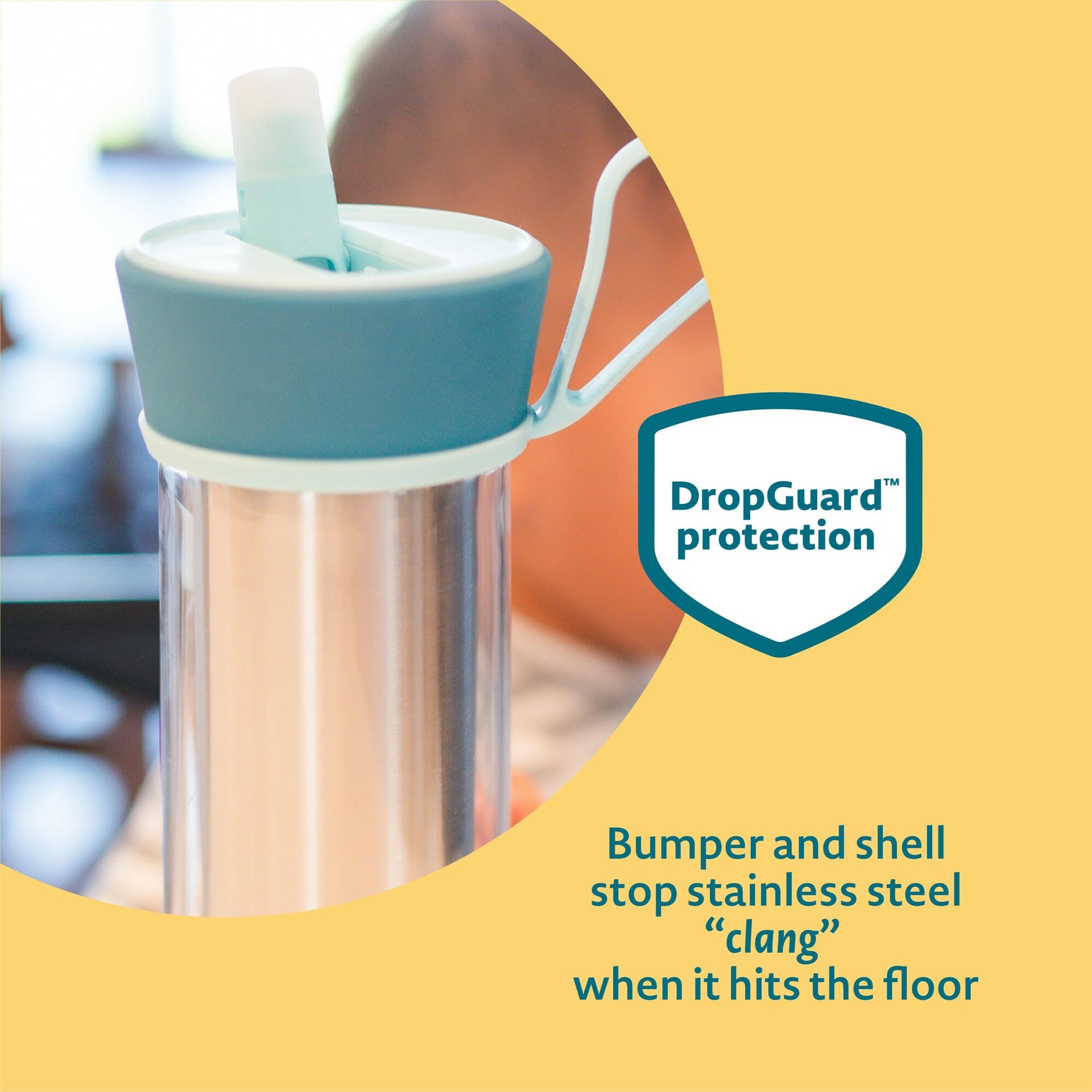 CoolCore™ keeps drinks cool without the clang! The double-walled bottle with a stainless steel interior insulates drinks to keep them at a tasty temperature. The outer wall with DropGuard protects the bottle from denting or other damage when it drops - or when your toddler tosses it - without the jarring clang of stainless steel hitting the floor. And the leak proof design means no worries about puddles on the floor This toddler water bottle gives clean sips too thanks to the pop-up straw with a silicone spout that stores flat when not in use. A quick push pops it up for sipping. The carry loop gives toddlers on the go an easy way to carry their drink around, but removes easily if not needed. Featuring a sleek design, this water bottle is a great pick for older kids too who want a water bottle to match their parent's version. Done sipping for the day? The water bottle is top rack dishwasher safe, and the covered pop-to-sip button means no worries about toddler's sticky hands getting goo stuck in crevices. Like all The First Years cups, this water bottle is made without BPA.