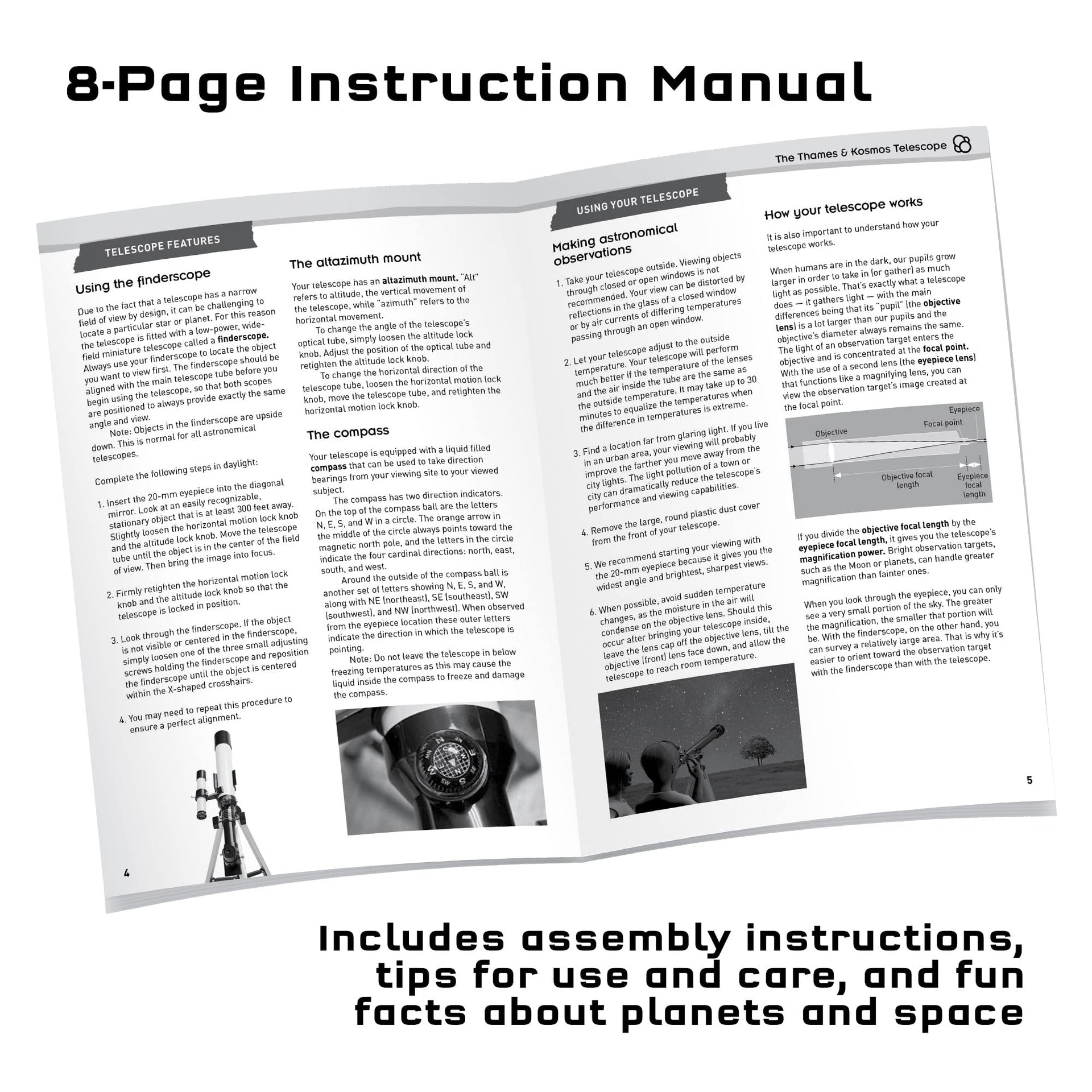 - An 8-page instruction manual guides setup and use of the telescope, including tips for cleaning and caring for this essential scientific instrument.