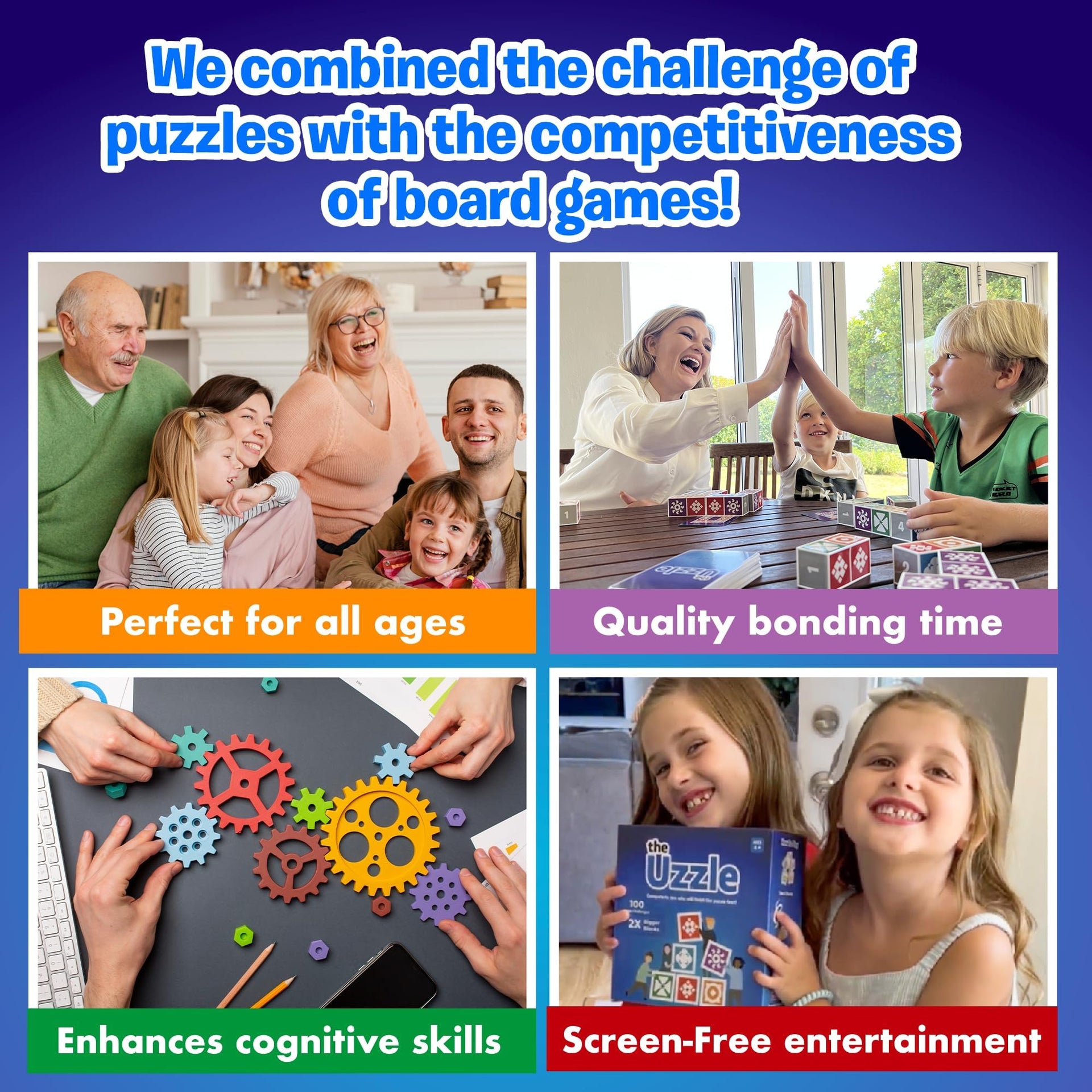 Compete With Family & Friends To See Who Will Be The Best The Uzzle 3.0 family games is our most competitive and challenging game yet! If you're skimming for a game to play once and leave out collecting dust for years - then you have come to the wrong place. But if you're here because you feel that your kids deserve better. That they deserve to have real-life experiences that bring genuine joy. Then welcome home! How to play? It's a very interesting game in this player's race to organize a set of 5 blocks so that they match a pattern shown on a card. The first player to complete grabs the card and a new matching race start. Suspense rise as you shuffle to outpace and outplay your competitors in this innovative game. So fire up your neurons and be fascinated by The Uzzle! 4 difficulty levels: Levels 1-2 are great for young kids. Levels 3-4 are great for adults. 25 puzzles per level. Impossible to memorize. What makes us different? 100 new puzzles 2x bigger blocks 4 difficulty levels Parent-Child Games: This game allows you to expend more time with your kids. The Uzzle board game increases the ability of kids to think and memorize when parents help their children.