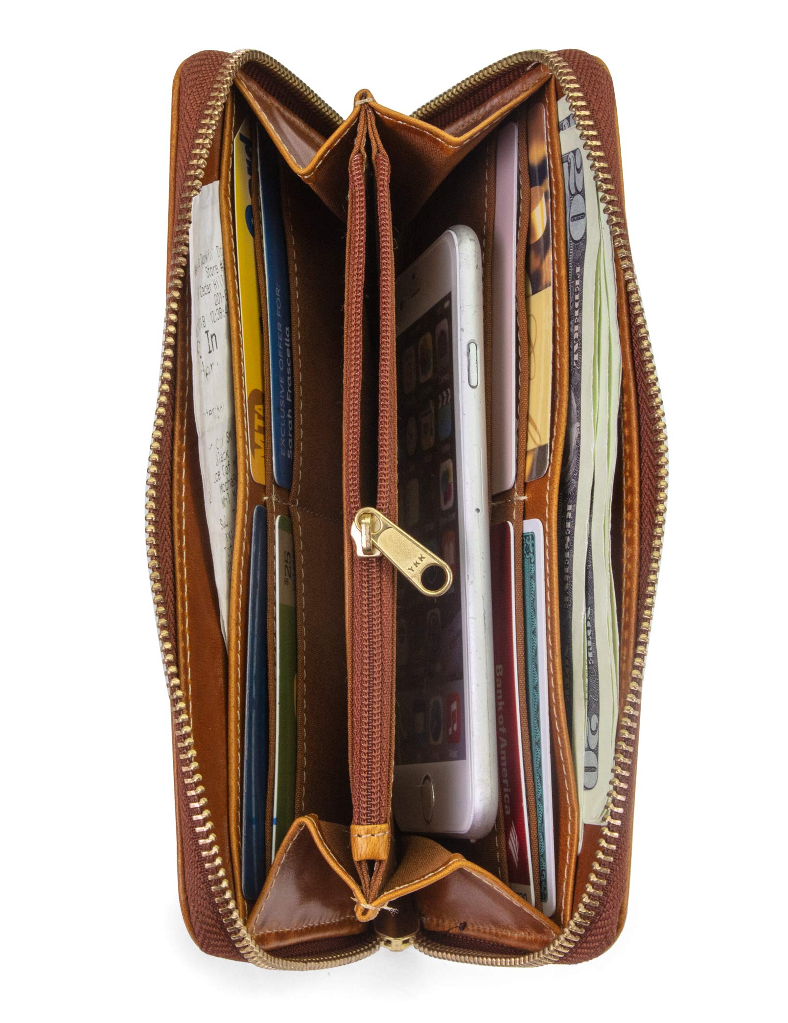 • Compact women's leather wallet - the interior of zippered wallet opens up to 2 large accordion pockets and has plenty of storage to carry all your essentials plus has the added benefit of being a wallet with rfid protection. Size 8" L x 4.25" H x .75" W
