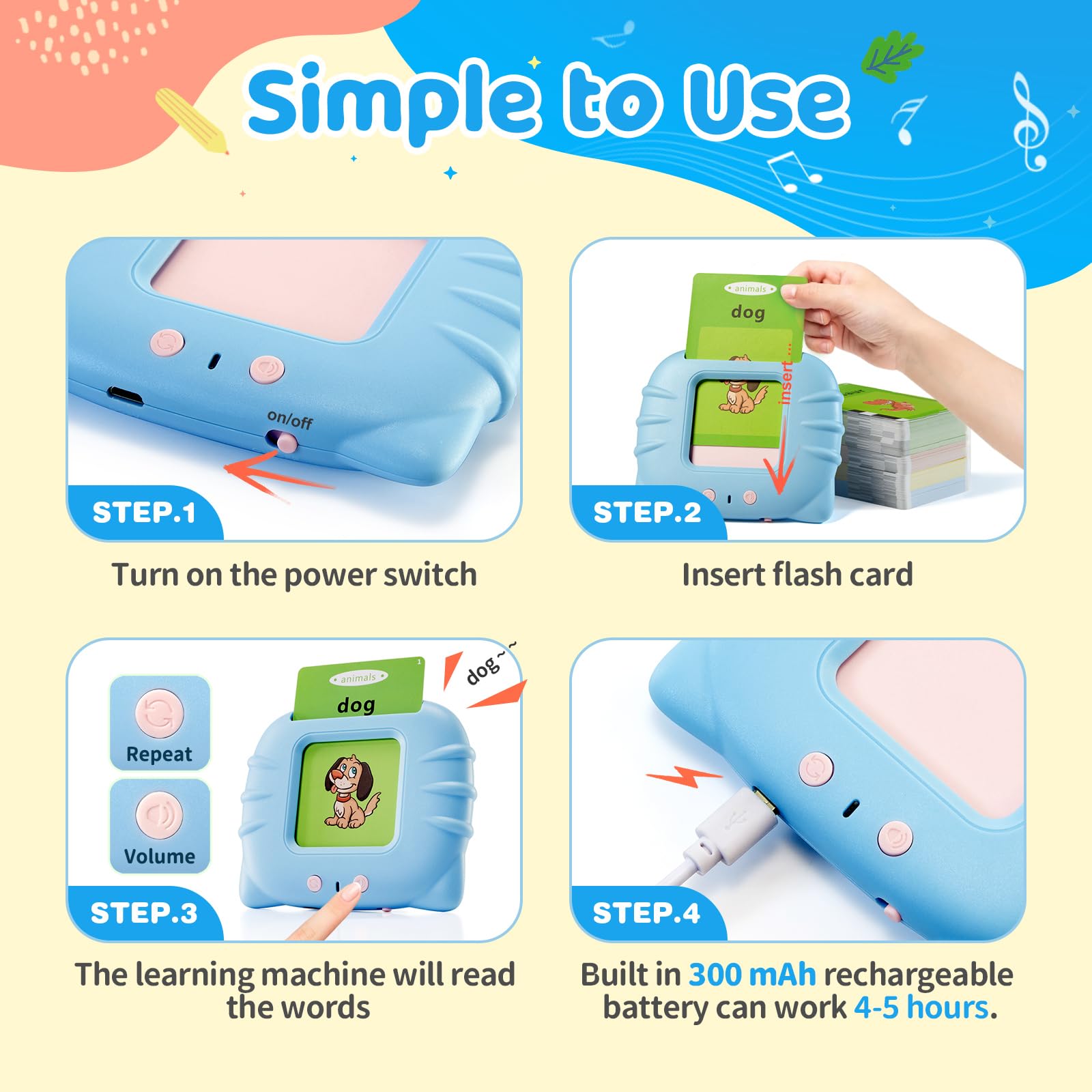 - 💕【Easy to Use 】Turn on the switch,put the card into the card reader’s slot,the card reader will pronounce the words in both English & Spanish.Press the repeat button to repeat the pronunciation and sound effect.