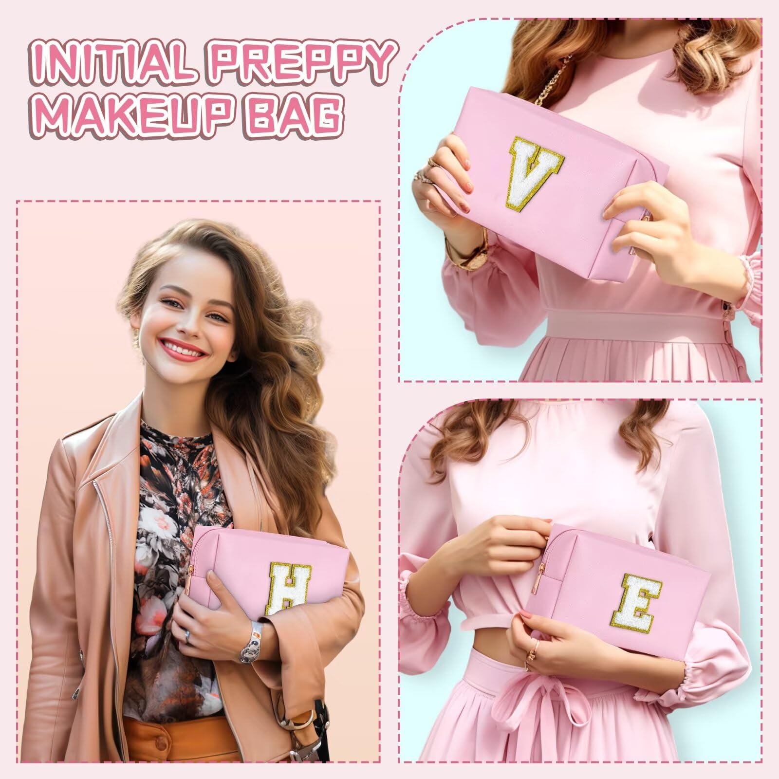 TOPEAST Initial Makeup Bag – Personalized Preppy Cosmetic Pouch, Leather Toiletry Bag, Birthday Gifts for 4–12 Year Old Girls (Pink A)