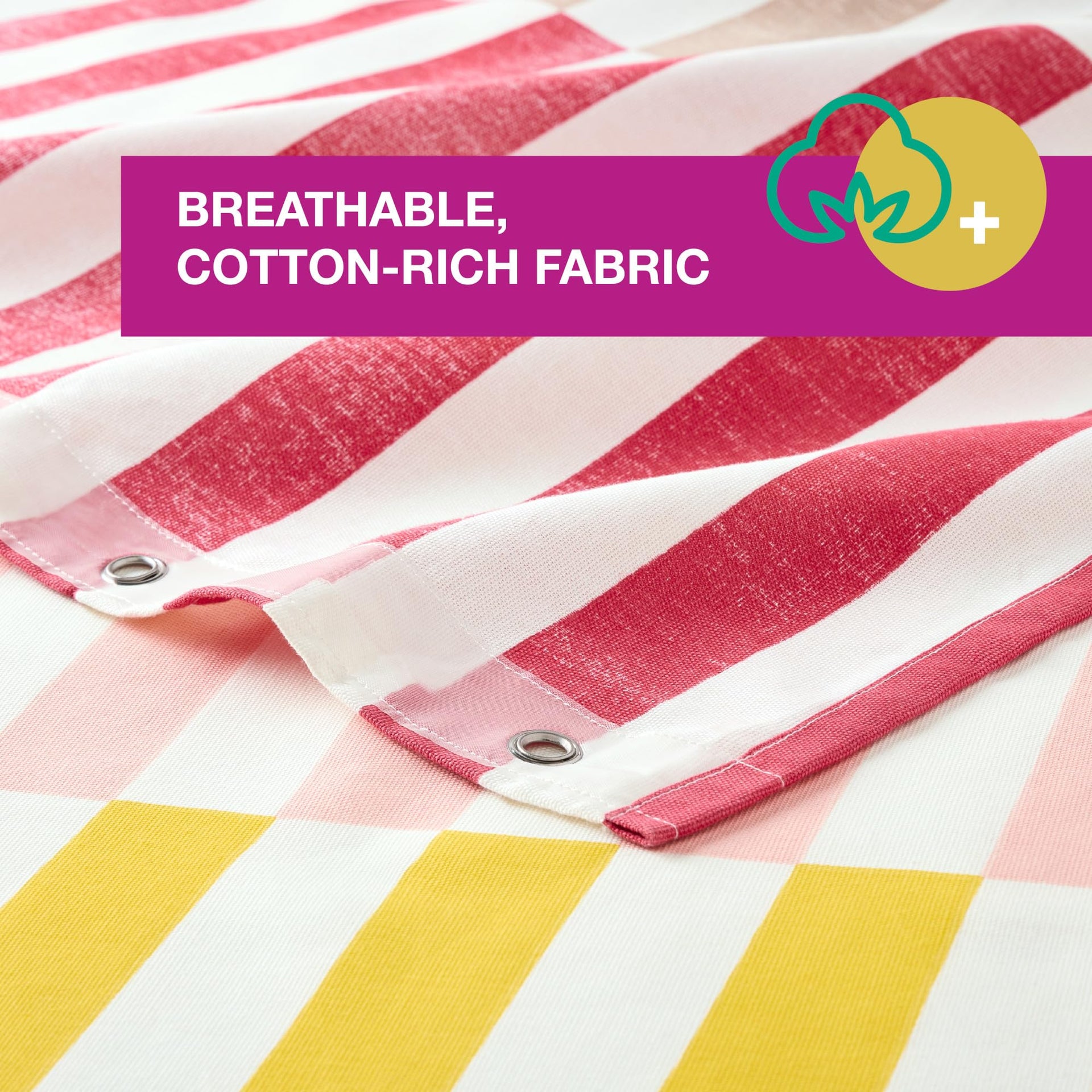 Go bold with your bathroom design by adding a Town & Country Play shower curtain into your space! With vibrant colors and a playful pattern, this Cotton-rich, fabric shower curtain will instantly transform any shower or bathroom. The Adeline Offset Stripe 70"x72"shower curtain offers a colorful, modern look with durability to last. Made with strong, reinforced top hem stitching and anti-rust grommets, this striped shower curtain is ideal for busy households and kid's bathrooms. Machine washable as needed for easy care. Use with waterproof shower liner recommended.