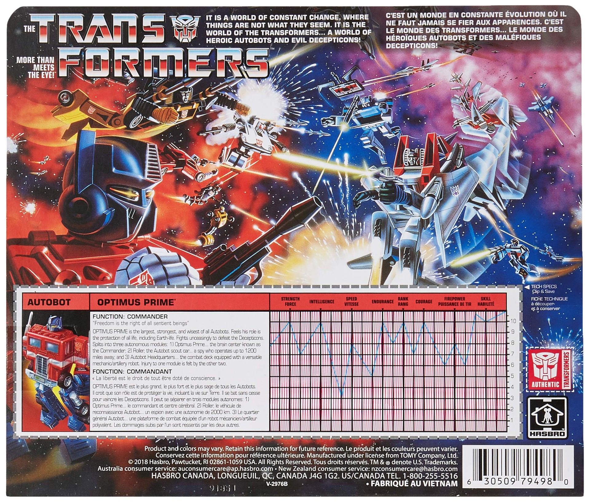 Complete with die-cast construction, this Transformers G1 Reissue Optimus Prime is just the thing for any old-school fan of robots in disguise! Experience the figures that started it all. This Optimus Prime figure is designed like the original G1 version - including figure styling, packaging, and art inspired by the 1984 release, plus classic tech specs and accessories. Optimus Prime is the largest, strongest, and wisest of all Autobots. He feels his role is the protection of all life, including Earth-life, and fights unceasingly to defeat the Decepticons. This figure comes with blaster accessory and converts between tractor trailer and robot modes in 6 steps. Clip out and save the on-box tech specs to share, then see how this figure compares to other heroic Autobots and evil Decepticons (each sold separately). G1 trailer accessory not included. Includes 6-inch robot figure, 4 accessories, label sheet, and instructions. Ages 8 and up.