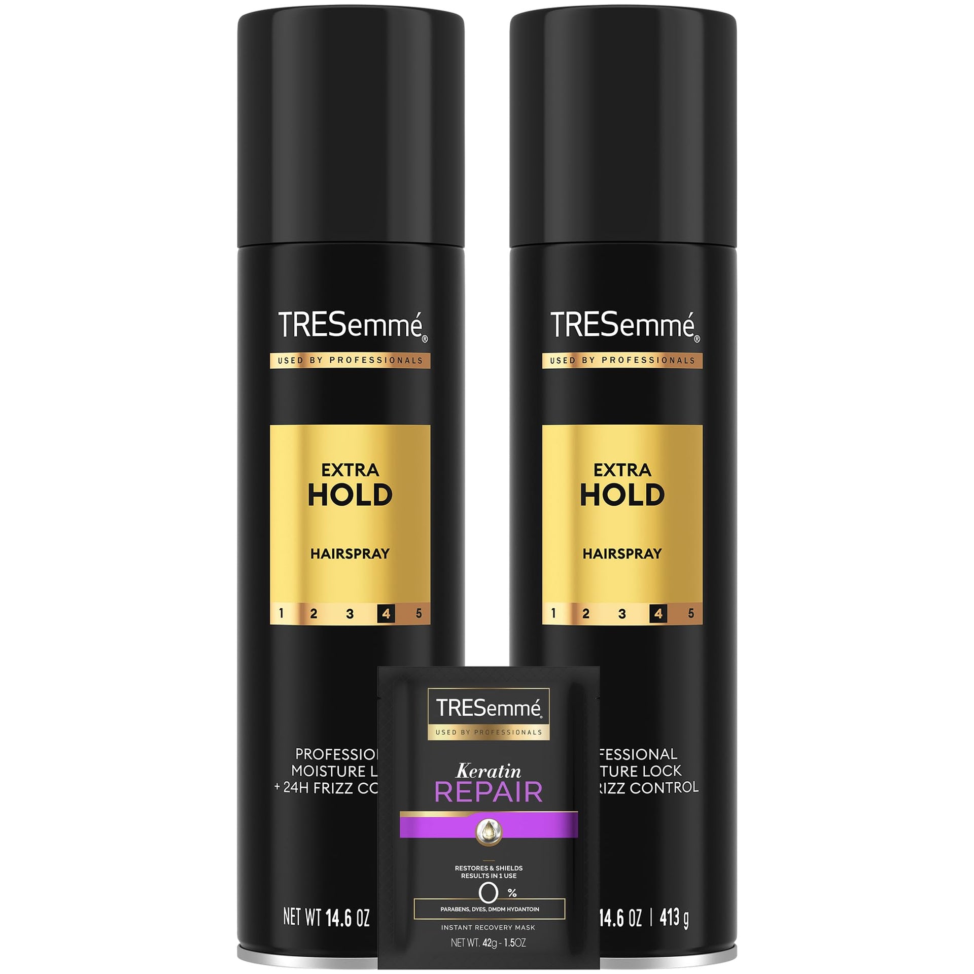 • TRESEMME HAIR SPRAY, ANTI-FRIZZ: Stock up on two full-size bottles of the TRESemmé Extra Hold Mousse (10.5 oz ea) with Moisture Lock and a single pack of the Keratin Repair Mask (1.5 oz) - perfect for taming frizzy hair and flyaways.