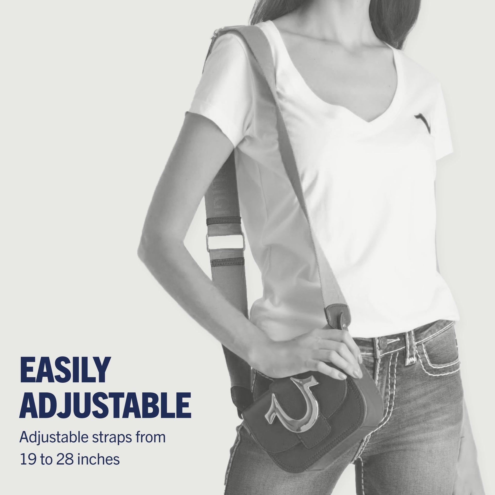 • TRUE RELIGION CROSSBODY PURSE: Cute and stylish ladies shoulder bag featuring the True Religion horseshoe logo prominently displayed in striking gold hardware, a polyester lined interior, and a conveniently adjustable shoulder strap
