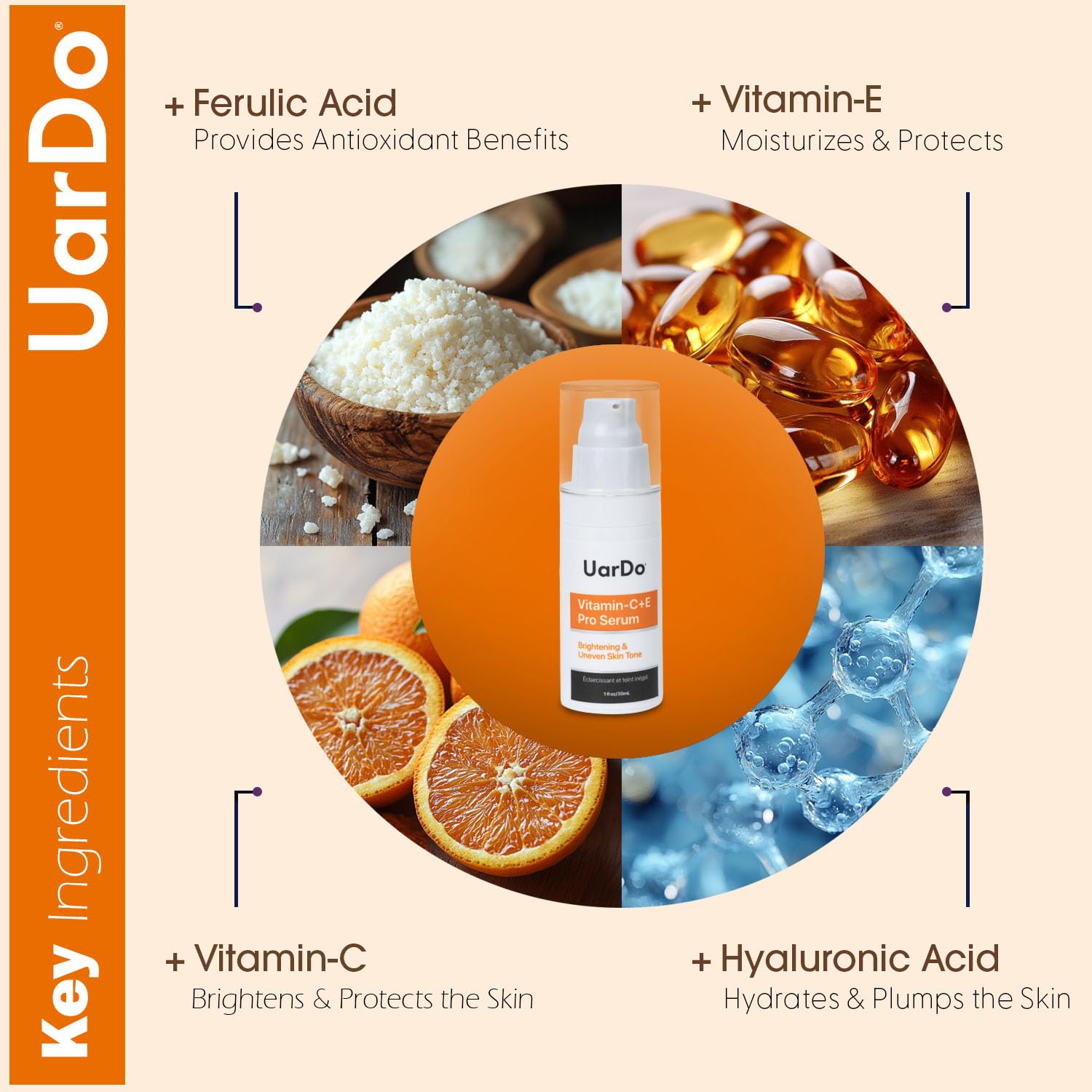Enrich your skin with the potent power of Vitamin C and E with Uardo Vitamin-C+E Pro Serum. This innovative serum harnesses the properties of powerful ingredients like Cyclopentasiloxane, Milk Thistle, and Cultivated Two-Row Barley Extract. Vitamin C brightens your complexion and evens out skin tone, while Vitamin E contributes to skin's hydration and nourishment. Hexylresorcinol enhances the serum's effectiveness by reducing the appearance of fine lines and wrinkles, and essential oils like Lime and Sandalum add a refreshing fragrance and additional skin-soothing benefits. This lightweight formula absorbs easily into the skin, leaving it feeling soft, supple, and revitalized. Uardo Vitamin-C+E Pro Serum is highly recommended for individuals who are aiming to enhance their skin's glow and fight against the tell-tale signs of aging. It's particularly beneficial for those whose skin appears dull or tired, providing a revitalizing boost. This anti-aging, hydrating face serum has been specially formulated to target dark spots, fine lines, and wrinkles, working to improve skin texture and tone. Experience the refreshing and age-defying effects of the Uardo Vitamin-C+E Pro Serum.