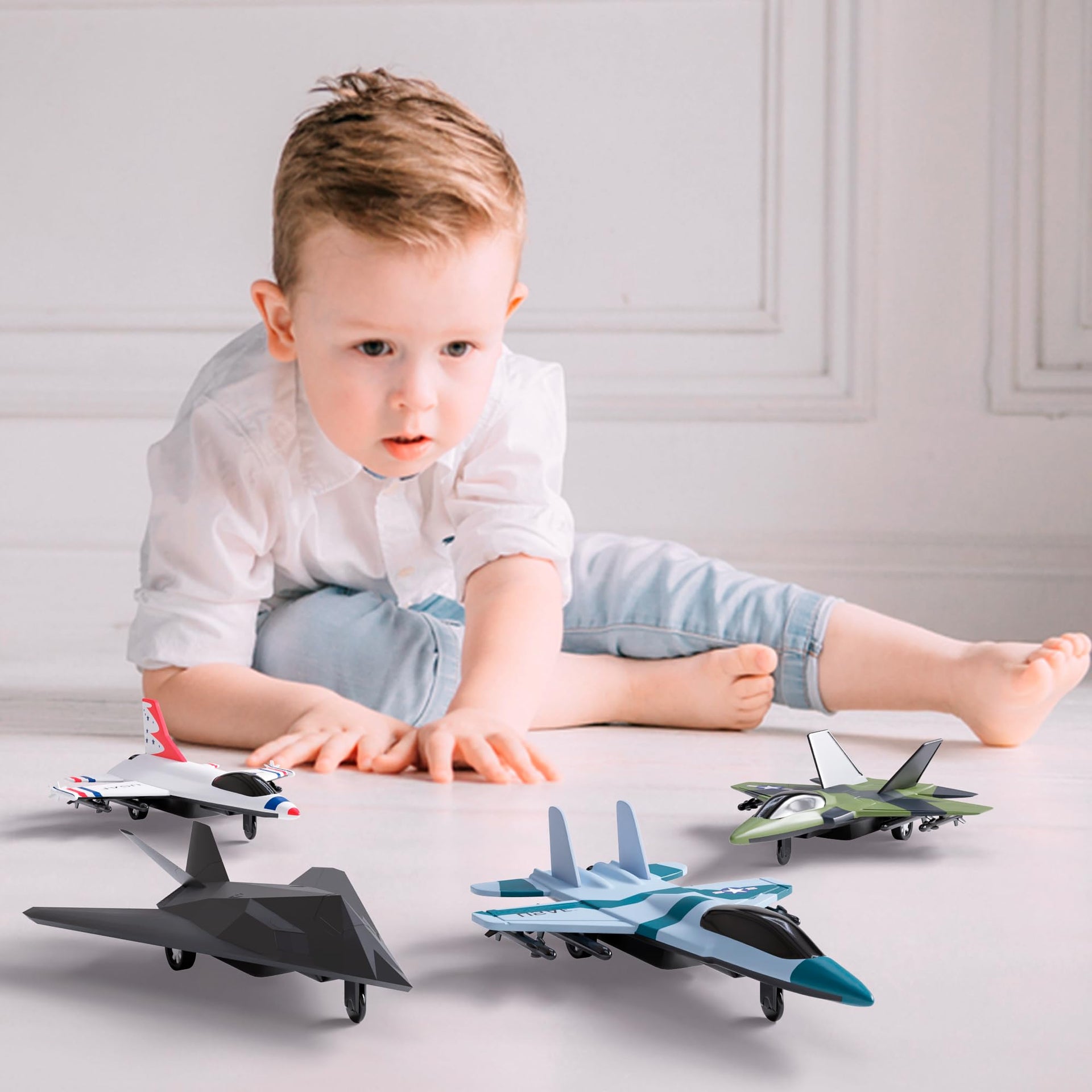 Lollipop's US Air Force toys are licensed by the U.S. Air Force. Each toy military jet airplane diecast is inspired and carefully detailed based on the features of real air plane fighter jets used by the American military force to give kids a vivid picture and help step up their war and rescue missions at home.What's Included?x4 Small metal planesAge Range: Children 3 years old and up.TOUGH & SAFE PLASTIC: The metal jet planes die cast toys from Lollipop use only lightweight and durable materials that can hold up to children's use. The alloy diecast planes set is child-friendly and suitable for children ages 3 and up.ALL-OCCASION GIFT: An officially licensed military diecast toy fighter jet makes an excellent gift for little US Air Force fans. Complete his/her collection with lifelike air force toys on his/her birthday, Christmas, and other fun occasions!