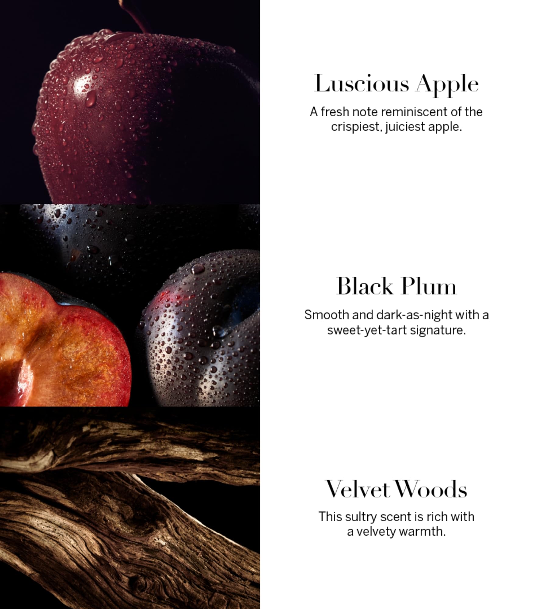 - Scent notes of black plum, velvet woods, and luscious apple.type: Floral Warm
